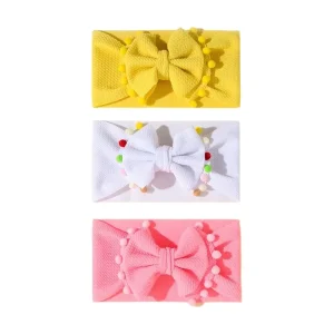 Bandeau bébé fille : lot de trois bandeaux élastiques pompon jaune blanc et rose