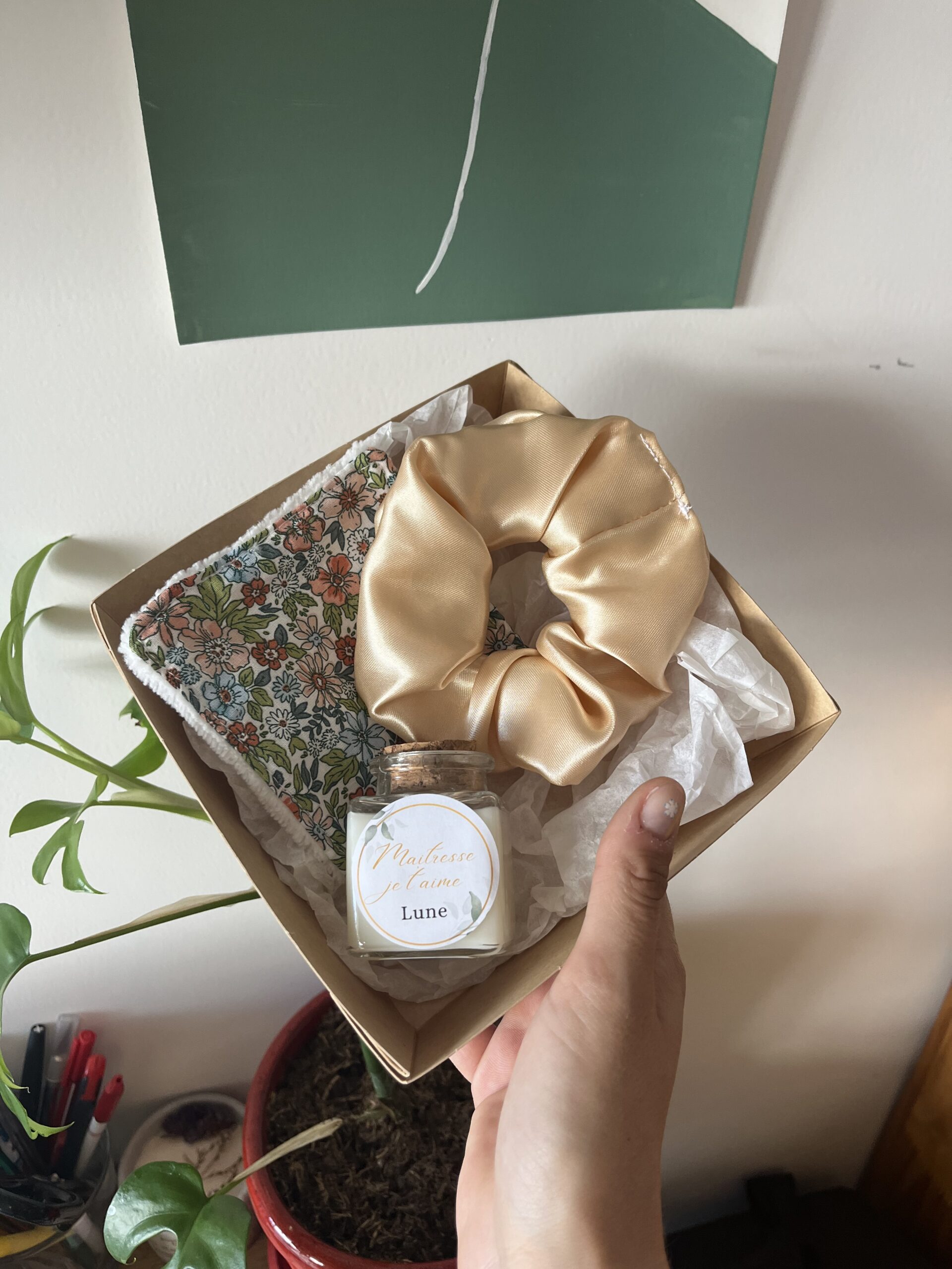 Le tout est soigneusement disposĂ© dans une boĂźte Ă©lĂ©gante, prĂȘte Ă ĂȘtre offerte telle quelle. Un coffret Ă la fois utile, touchant et plein de charme, fermĂ© avec un joli ruban.