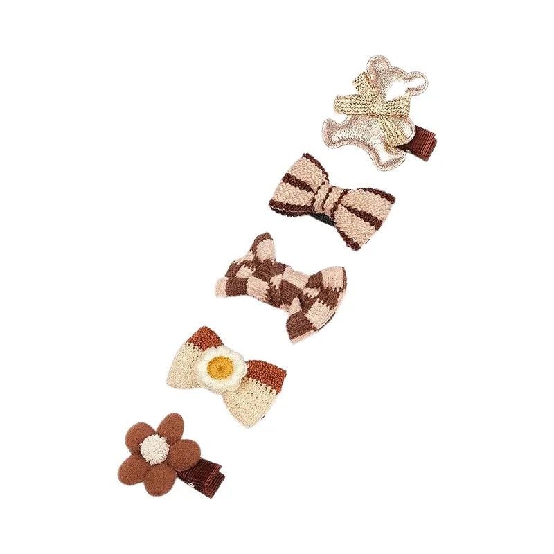 Barrette bébé : lot de cinq barrettes bébé ours marron, nœud marron, nœud vichy, nœud fleur et fleur marron