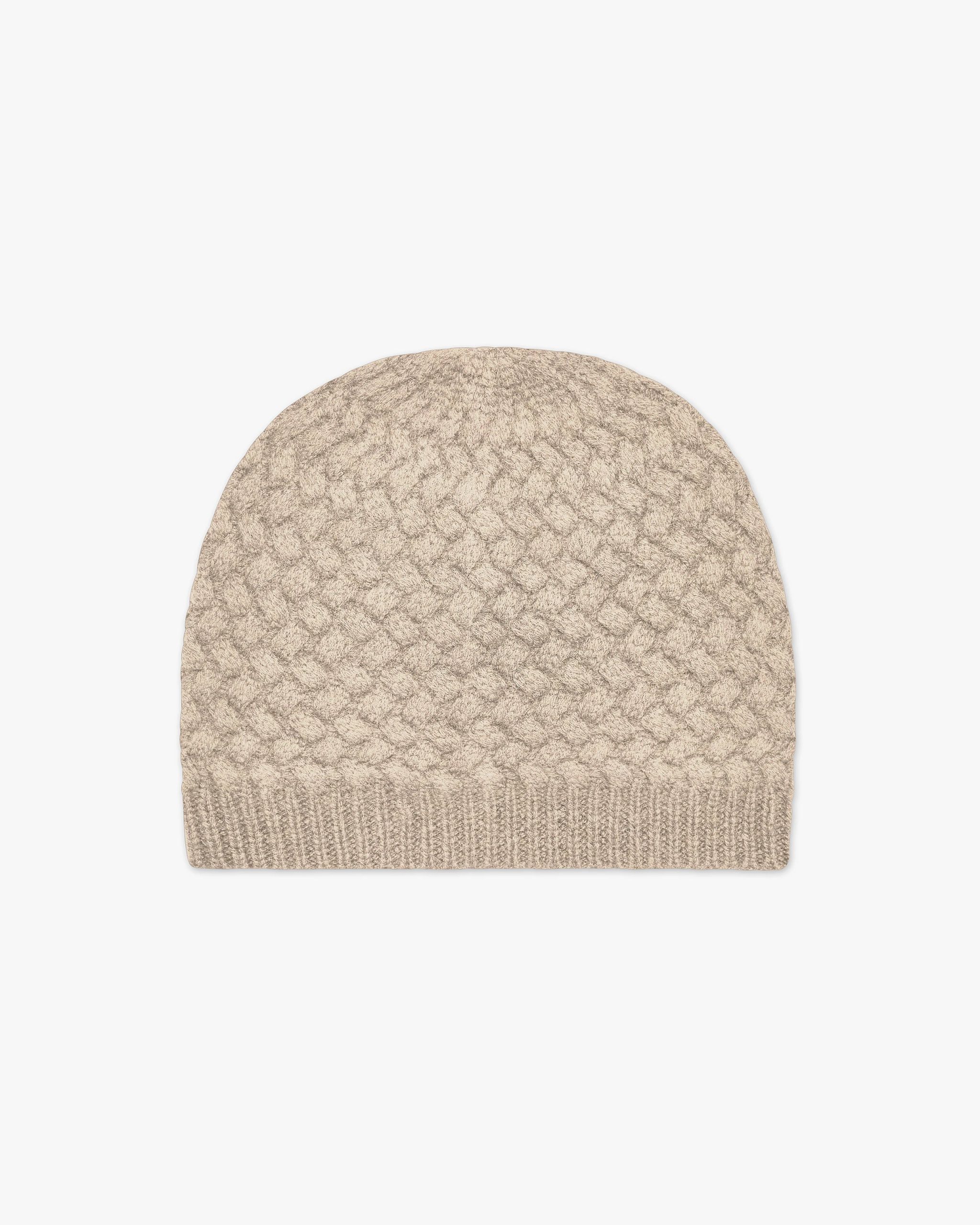 What makes this piece truly unique is its weave-inspired knit, covering the entire surface with a strikingly original pattern. A slim ribbed edge frames and shapes the circumference for a refined finish.