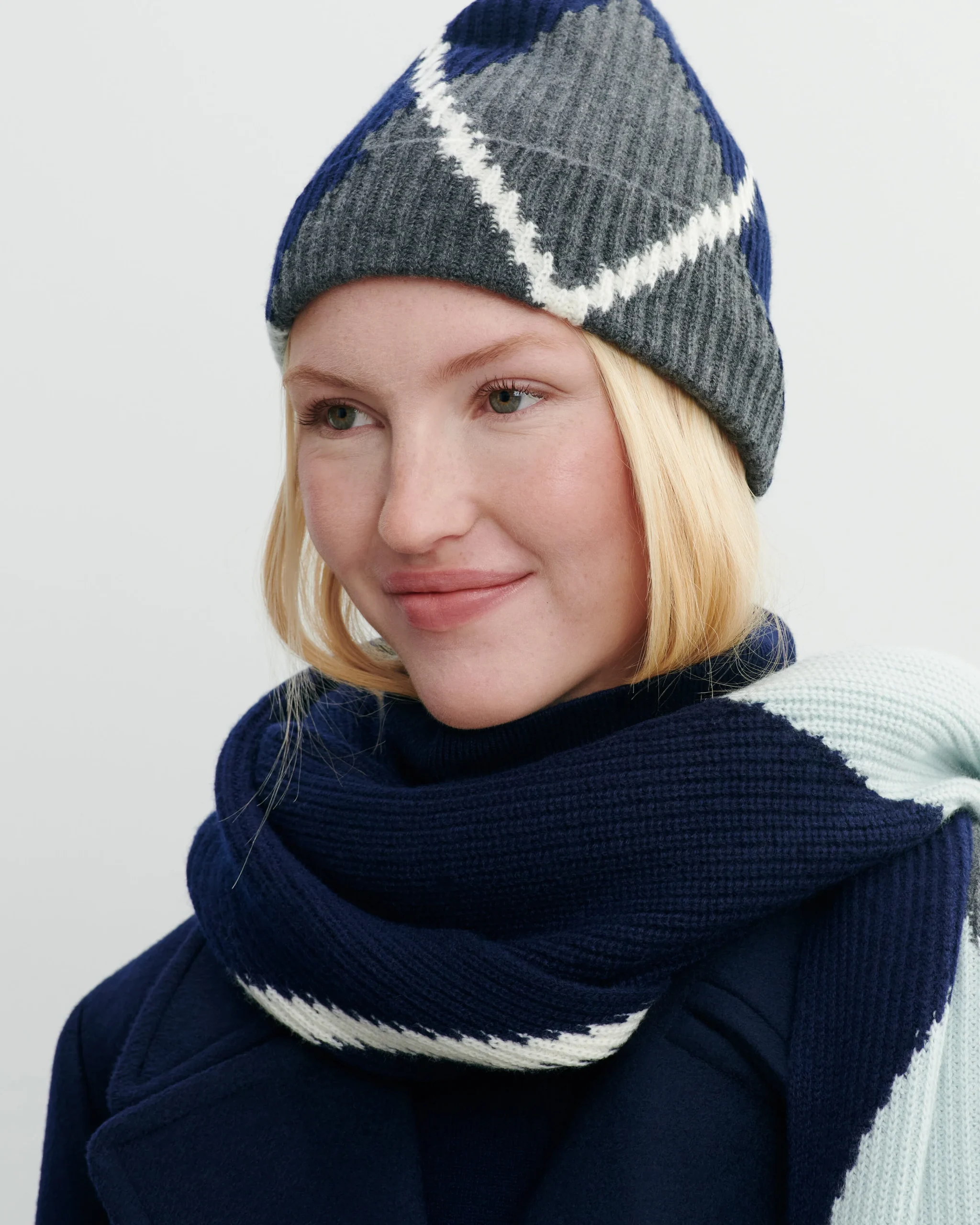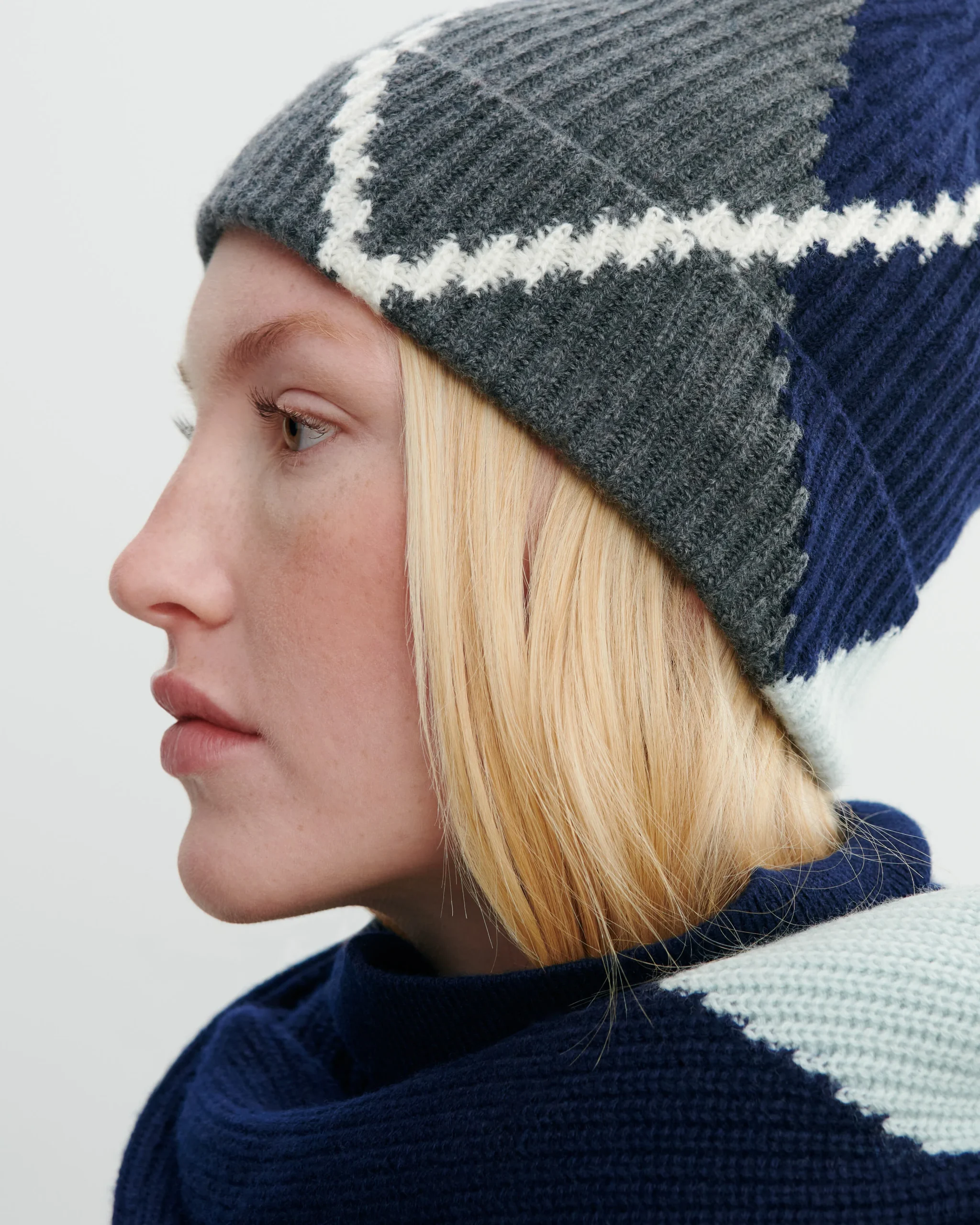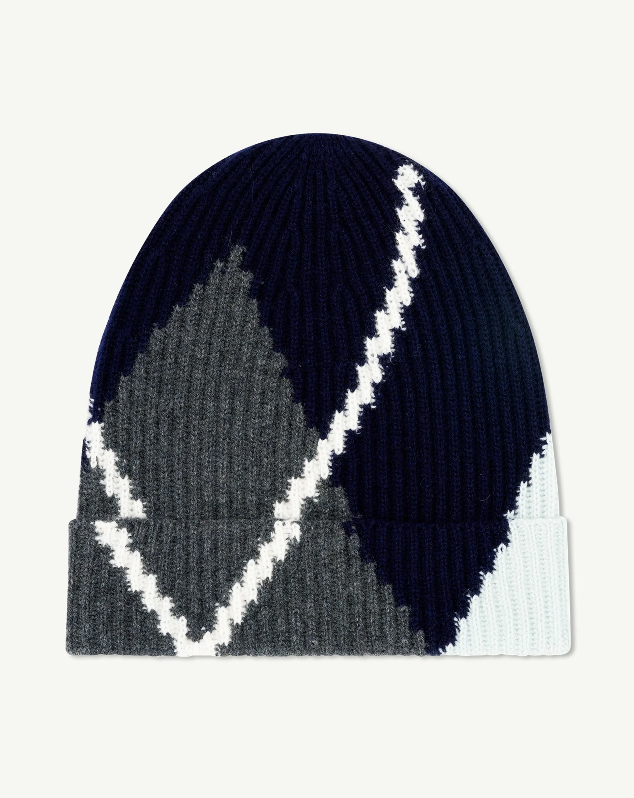 Bonnet en cachemire côtelé avec motif losange traditionnel. Modèle unisexe.