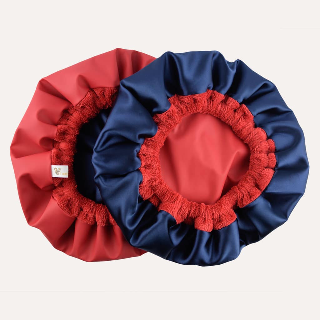 Die Kante aus Badetuch vermeidet, dass Wasser und Haarprodukte aus oder in dem Bonnet unerwünscht fließen.