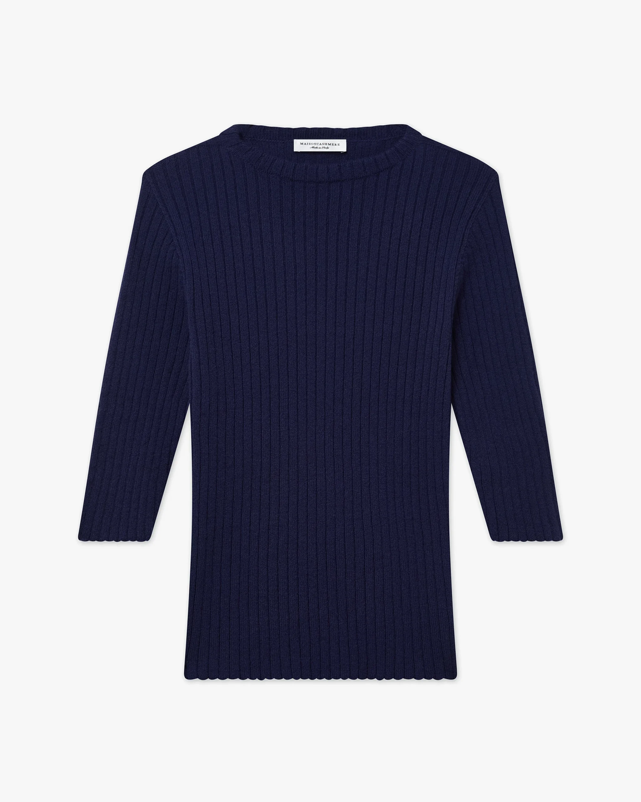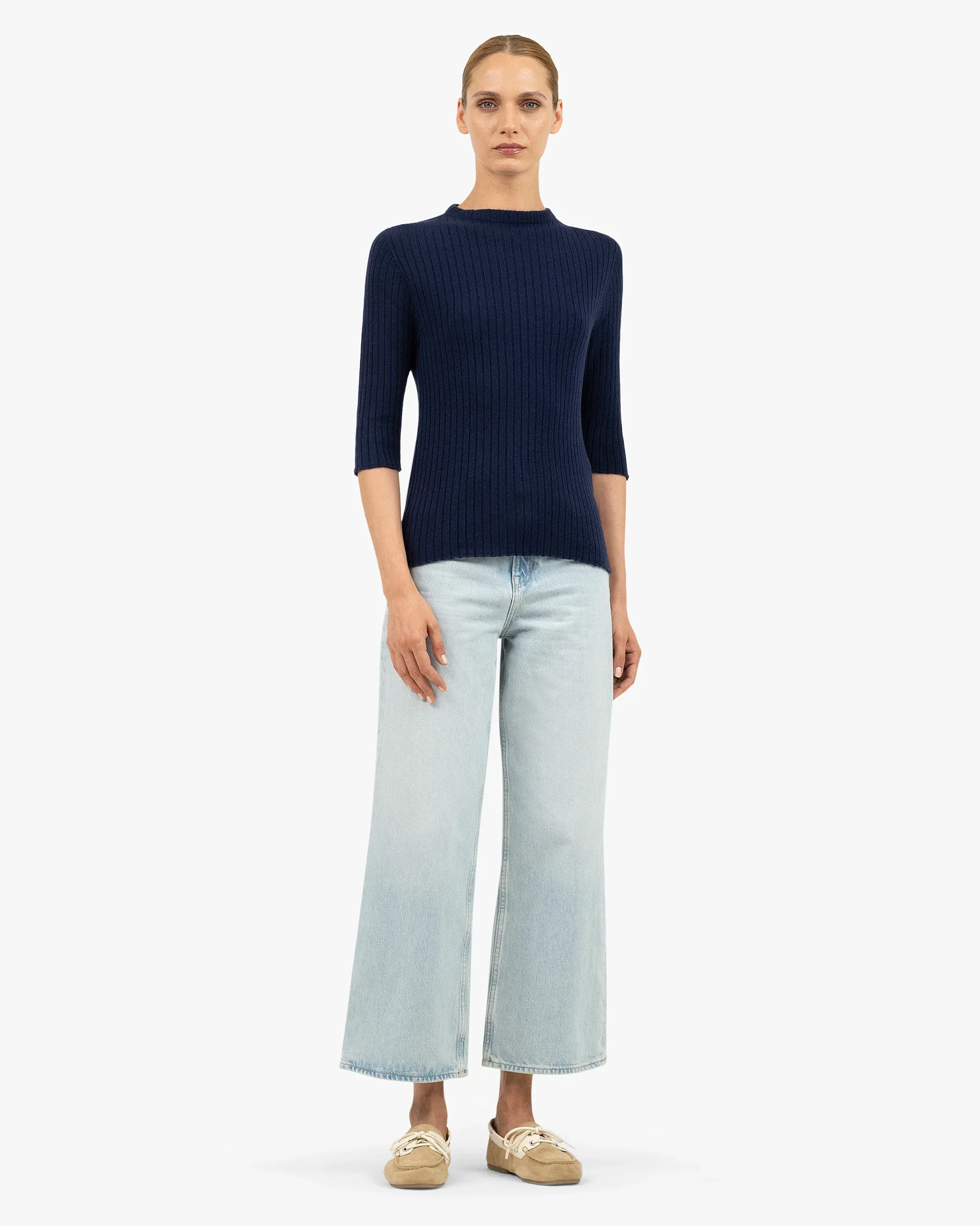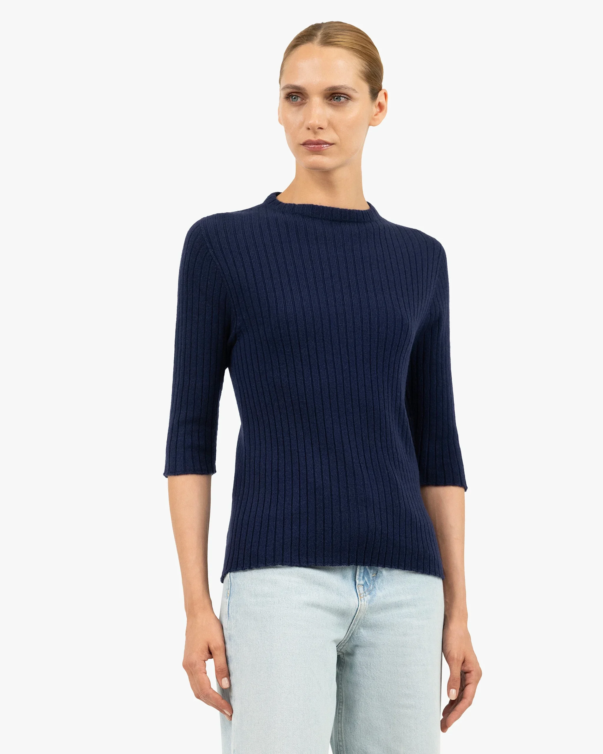 The classic crew neck, a wardrobe essential, is reimagined with three-quarter sleeves and a flat rib knit. Crafted from pure natural yarn, its clean design ensures softness, warmth and everyday comfort. Refined details include a flat ribbed neckline and raw-edge finishes at the cuffs and hem.