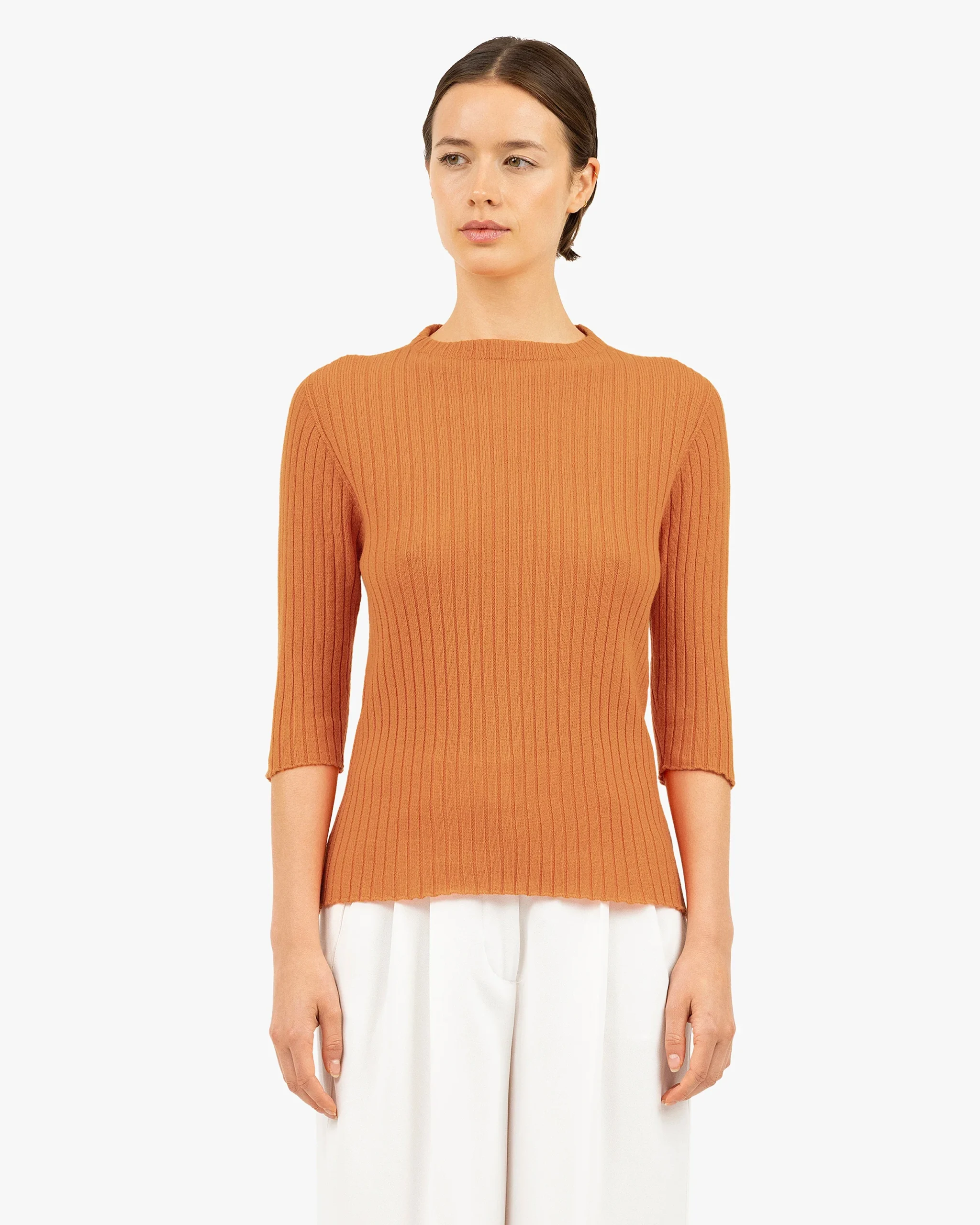 The classic crew neck, a wardrobe essential, is reimagined with three-quarter sleeves and a flat rib knit. Crafted from pure natural yarn, its clean design ensures softness, warmth and everyday comfort. Refined details include a flat ribbed neckline and raw-edge finishes at the cuffs and hem.