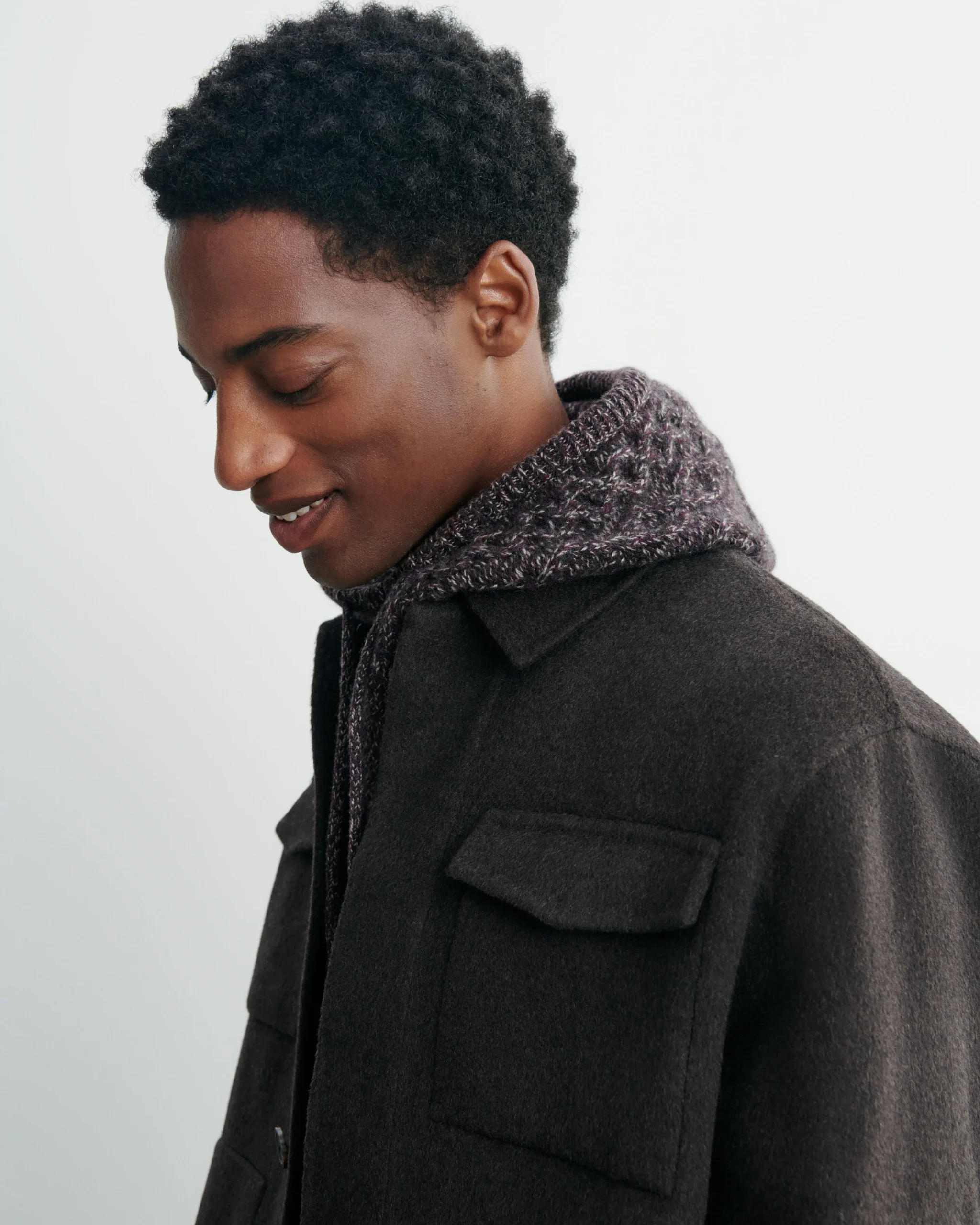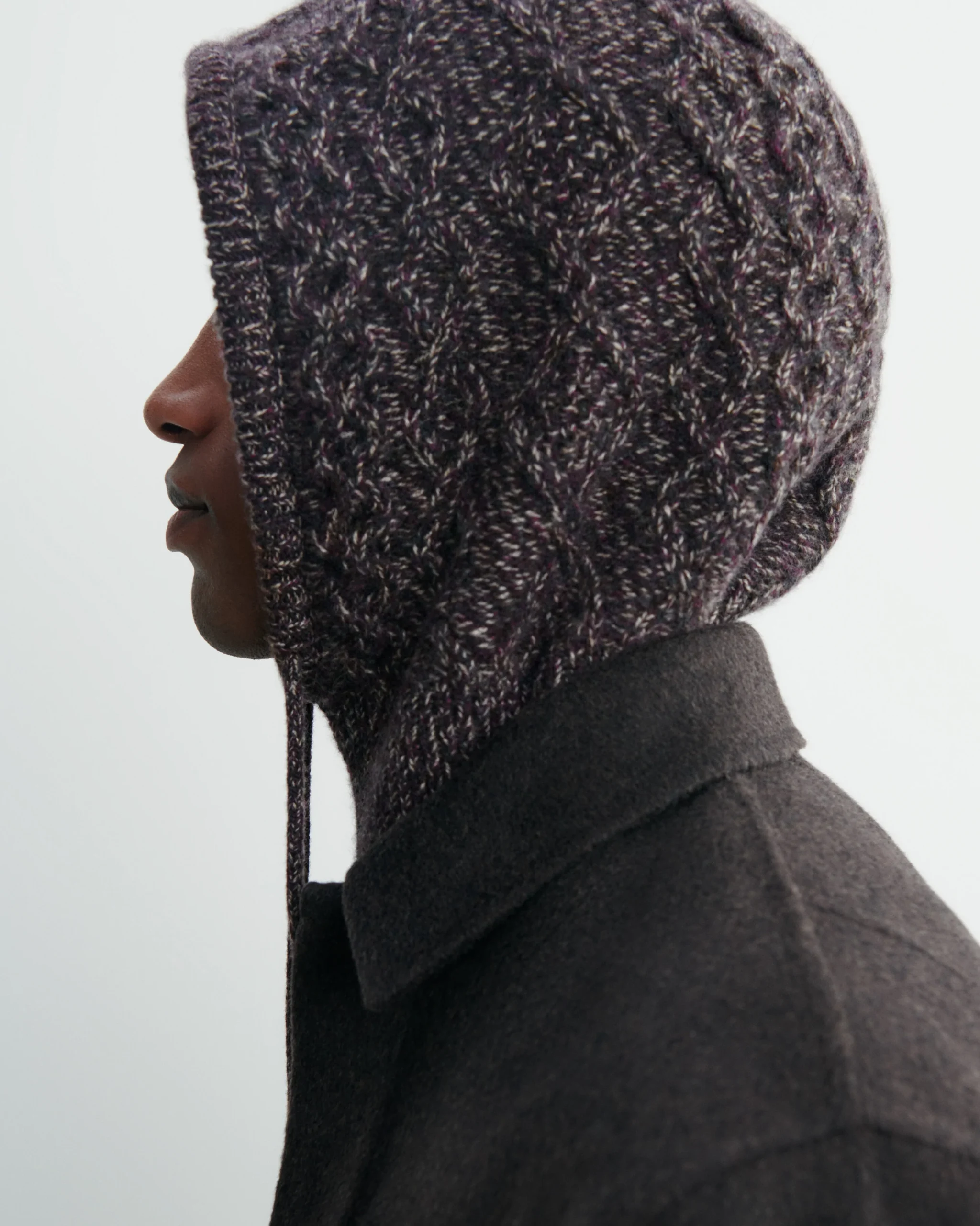 Cagoule à torsades en pur cachemire. Modèle unisexe, avec cordons de serrage tricotés