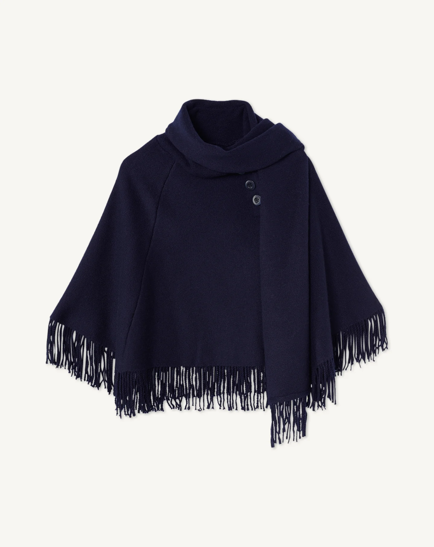 Poncho à franges en laine et cachemire. Col écharpe à nouer autour du cou.