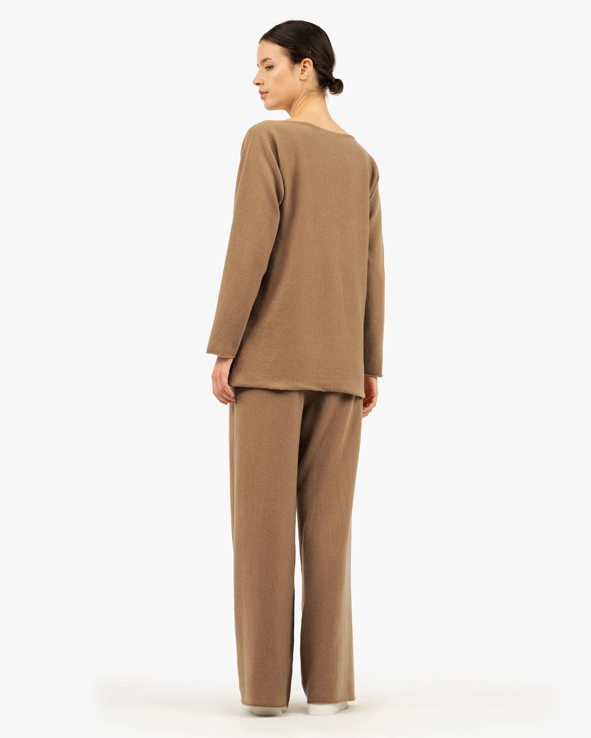 A sweater with a wide, essential cut and medium weight, made unique by its raw-cut finishes at the neckline, sleeves and hem. Crafted in tubular plain knit with a single raised seam running along the left side. Refined in its simplicity, offering total comfort and the warmth of pure cashmere. Perfect when worn as a twinset with its matching trousers.