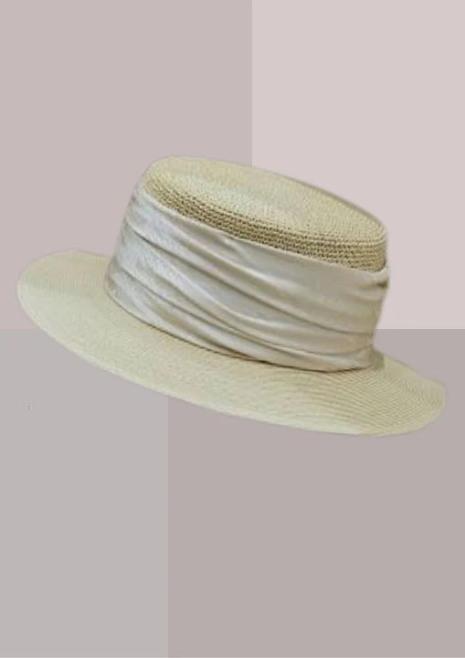 Le large bandeau de satin drapé autour de la calotte, dans une teinte ivoire assortie, apporte une touche de luxe et complète parfaitement l’ensemble. Ce chapeau élégant convient parfaitement aux occasions spéciales, que ce soit pour une réception, en tant qu’invitée de mariage ou pour tout événement où vous souhaitez vous démarquer avec style.