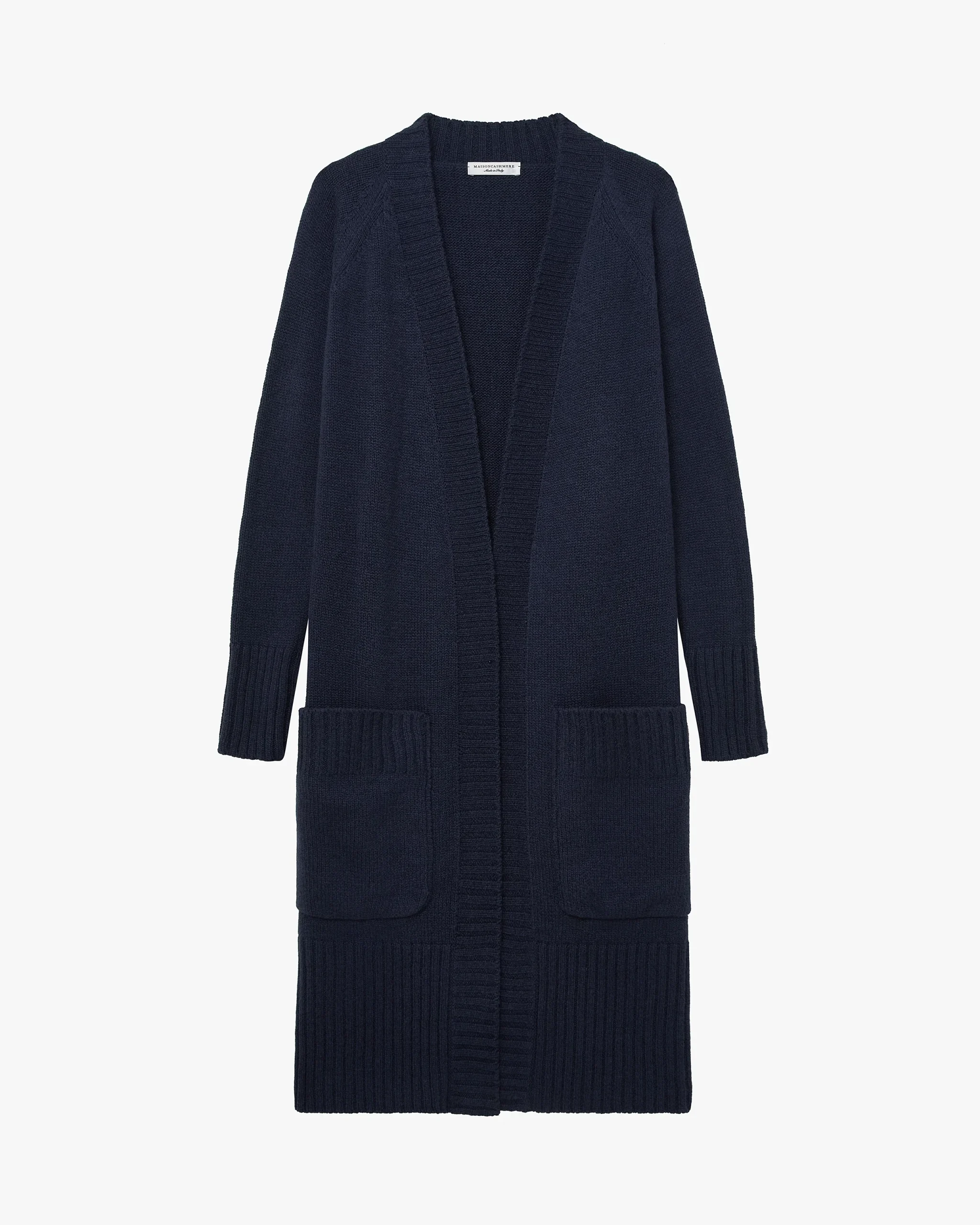 The design of this long cardigan is that of a practical and versatile knitted coat, offering full coverage that can also be cinched at the waist with a belt. Its ribbed finishes enhance the plain knit texture: distinctive features include oversized pockets, tall cuffs, and a wide trim that flows from the V-neck down the entire open front. Two side slits complete the look.
