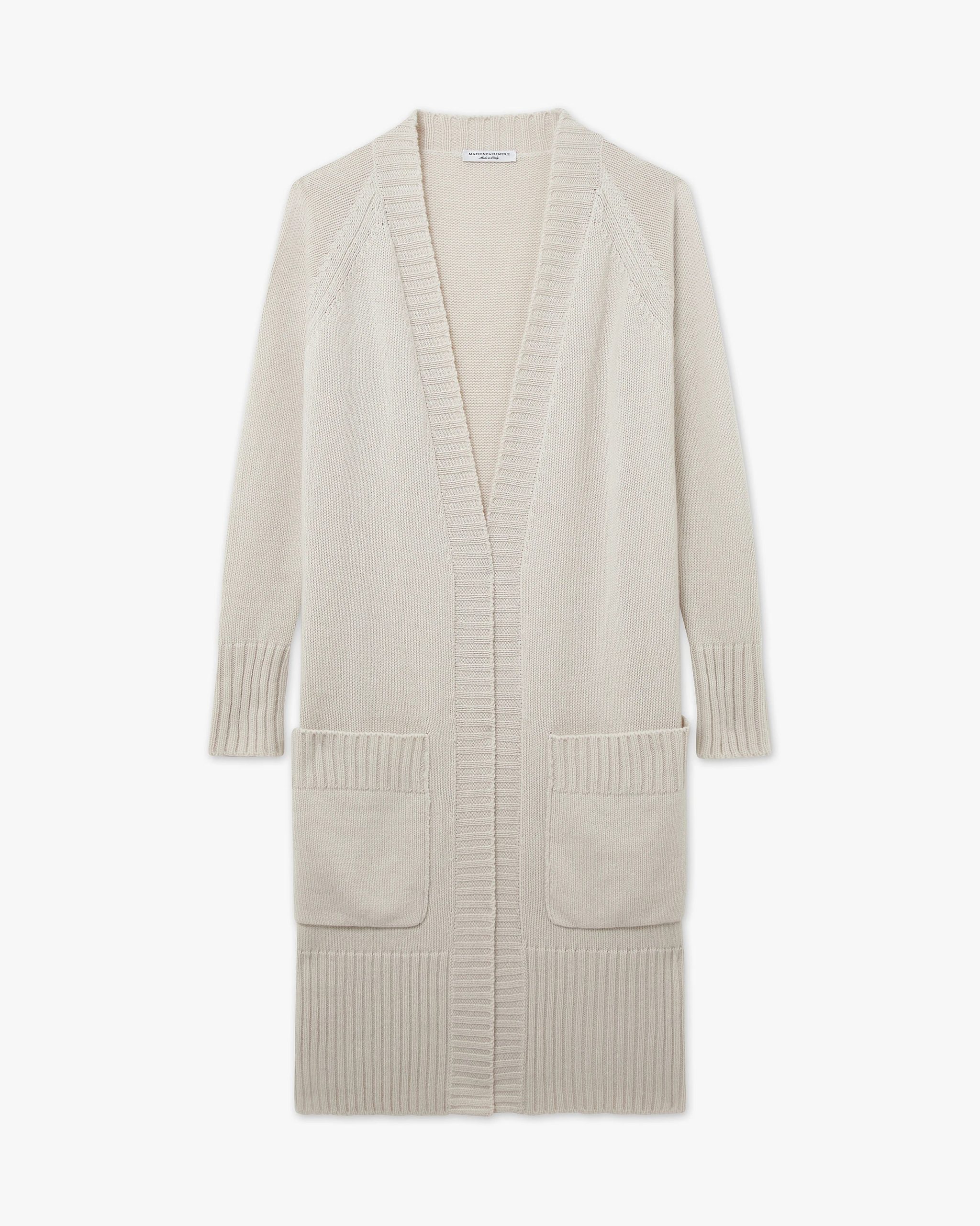 The design of this long cardigan is that of a practical and versatile knitted coat, offering full coverage that can also be cinched at the waist with a belt. Its ribbed finishes enhance the plain knit texture: distinctive features include oversized pockets, tall cuffs, and a wide trim that flows from the V-neck down the entire open front. Two side slits complete the look.