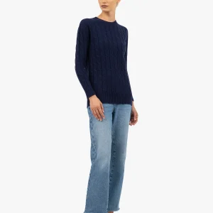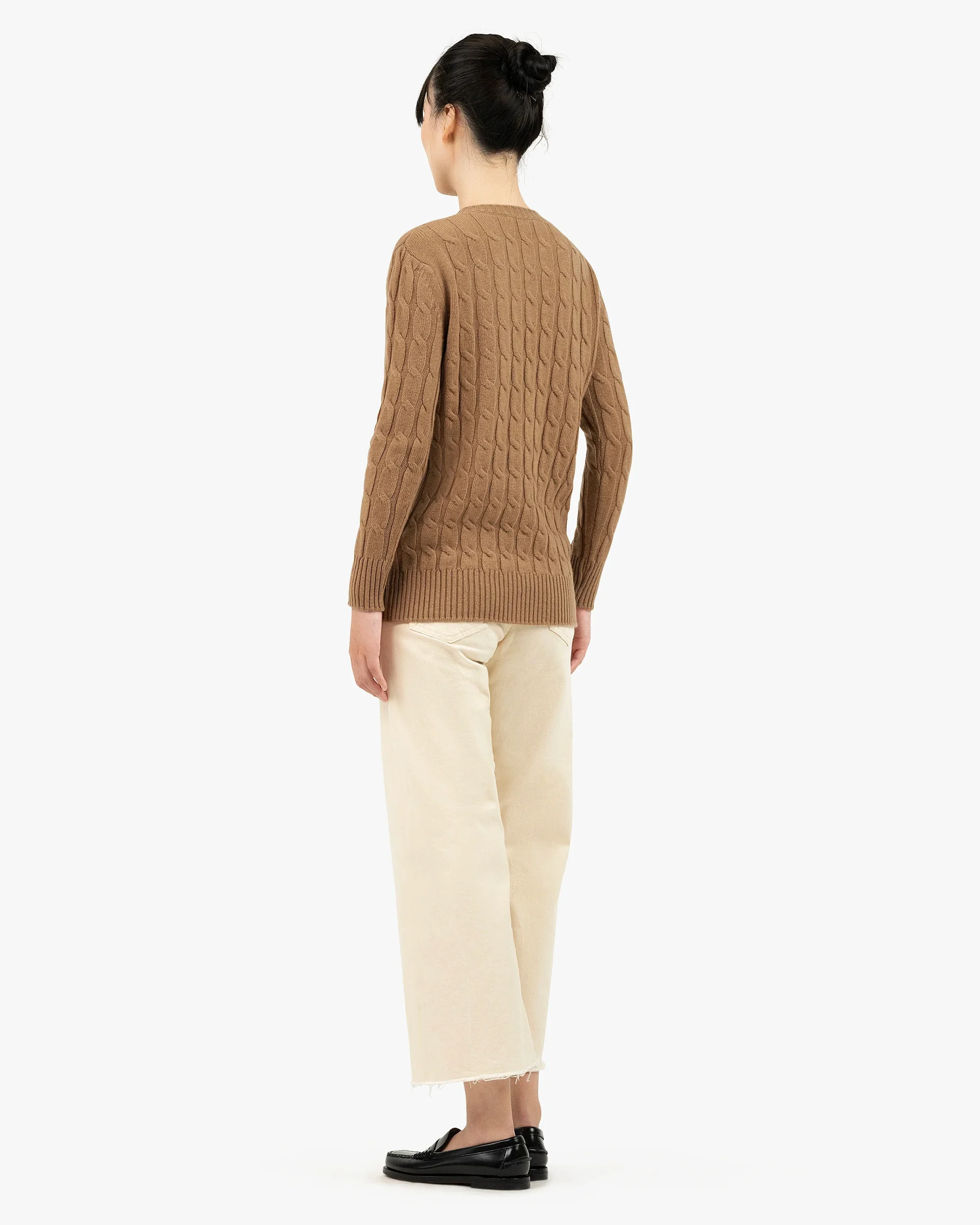 The most classic women’s sweater design is made unique by its all-over cable knit pattern, with cables spaced evenly and distinctly. Finely crafted ribbed trims, 6 cm high at the cuffs and hem, add a refined touch. A perfect blend of innovation and comfort, with all the elegance and warmth of pure cashmere yarn.