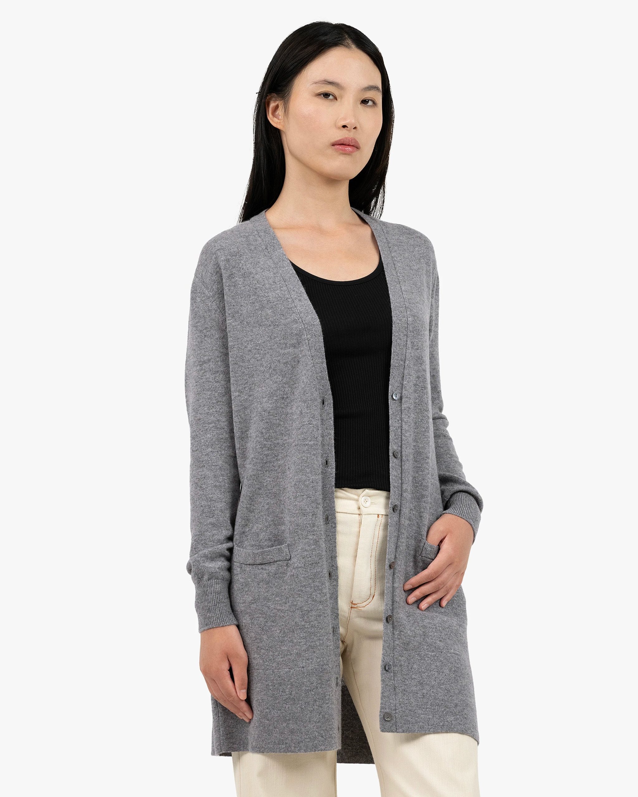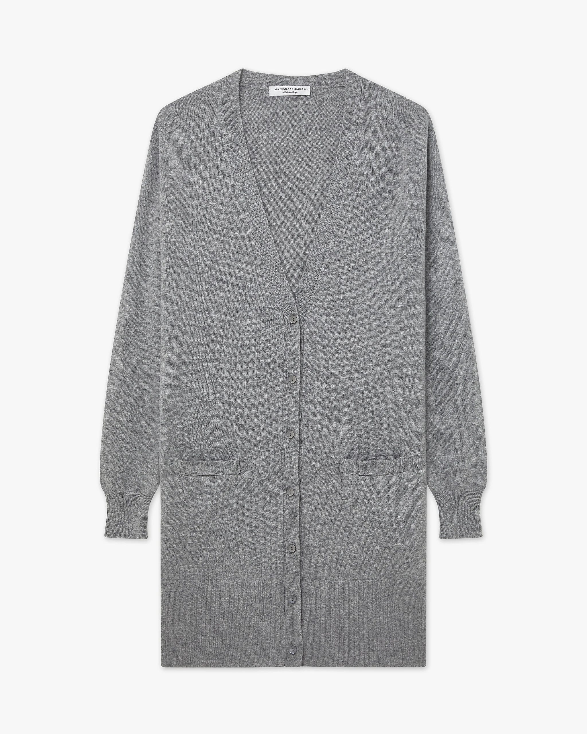 The long cardigan is the trendiest take on the classic design. Its silhouette gently follows your shape, wrapping you like a dress while offering all the warmth of cashmere. We designed it to be both elegant and practical, finished with slanted pockets and real mother-of-pearl buttons.