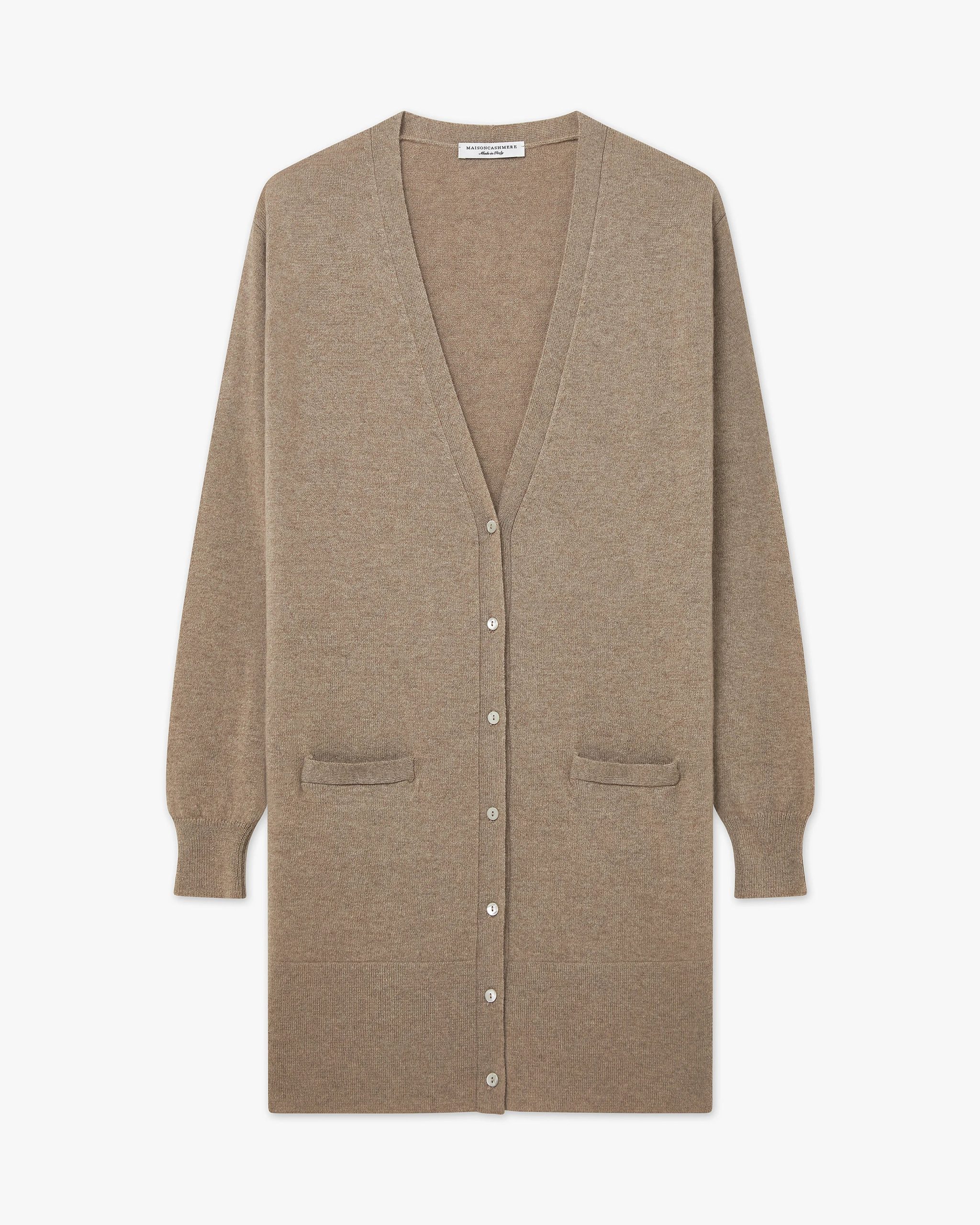 The long cardigan is the trendiest take on the classic design. Its silhouette gently follows your shape, wrapping you like a dress while offering all the warmth of cashmere. We designed it to be both elegant and practical, finished with slanted pockets and real mother-of-pearl buttons.