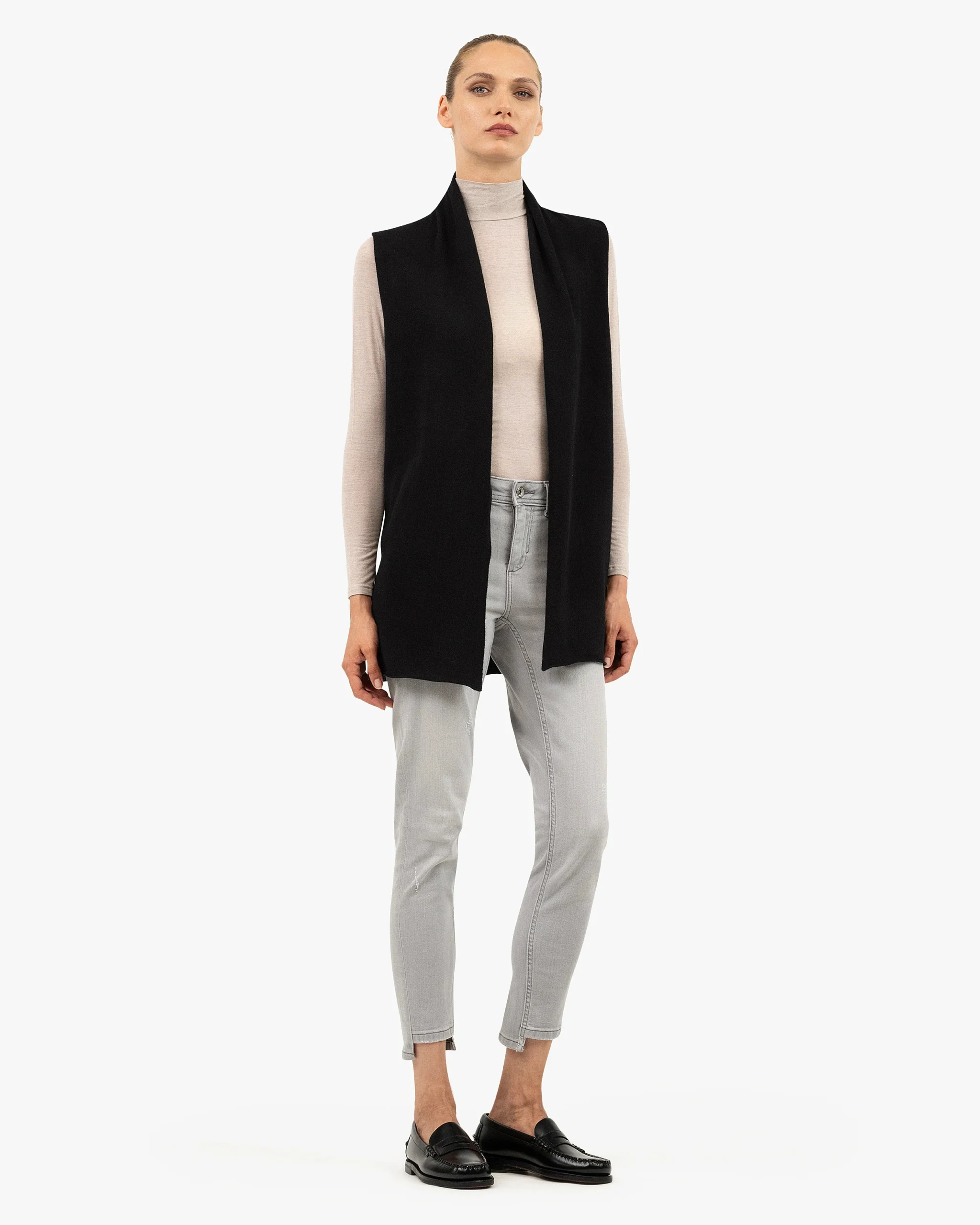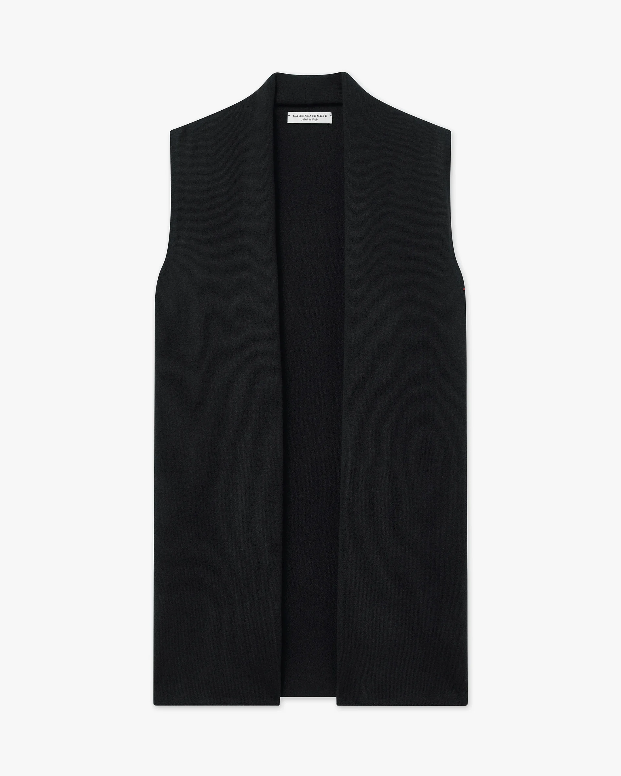 This design features a versatile fit that makes it suitable for countless occasions. Its length resembles that of a jacket, while the shawl collar falls open at the front without fastening. The sleeveless cut makes it easy to layer under coats or padded jackets. A true wardrobe staple for every season, thanks to its natural yarn.