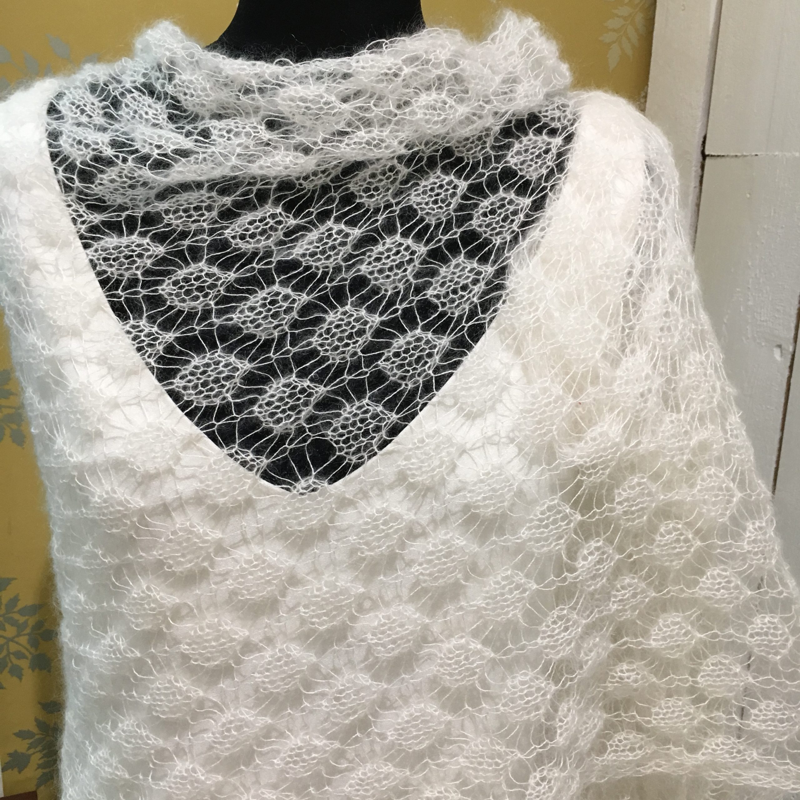 Cette magnifique étole ajourée en super kid mohair(55%) et soie naturelle(45%) tricotée avec notre fil mohair et soie le plus fin, se porte à merveille sur une robe de soirée ou de mariage, ou tout simplement en écharpe grâce à son extrême finesse.