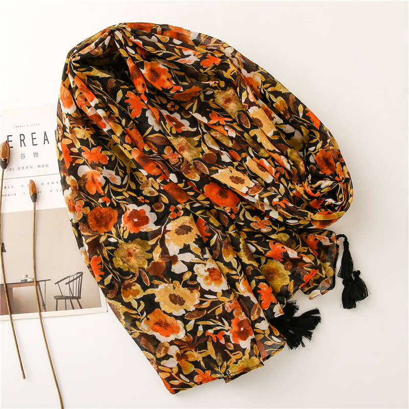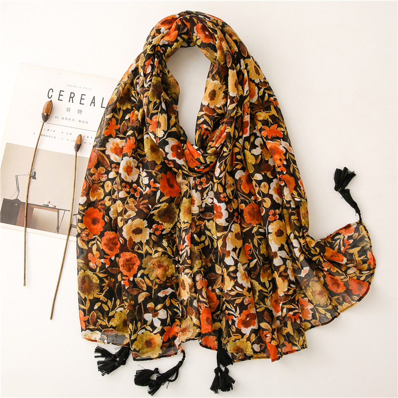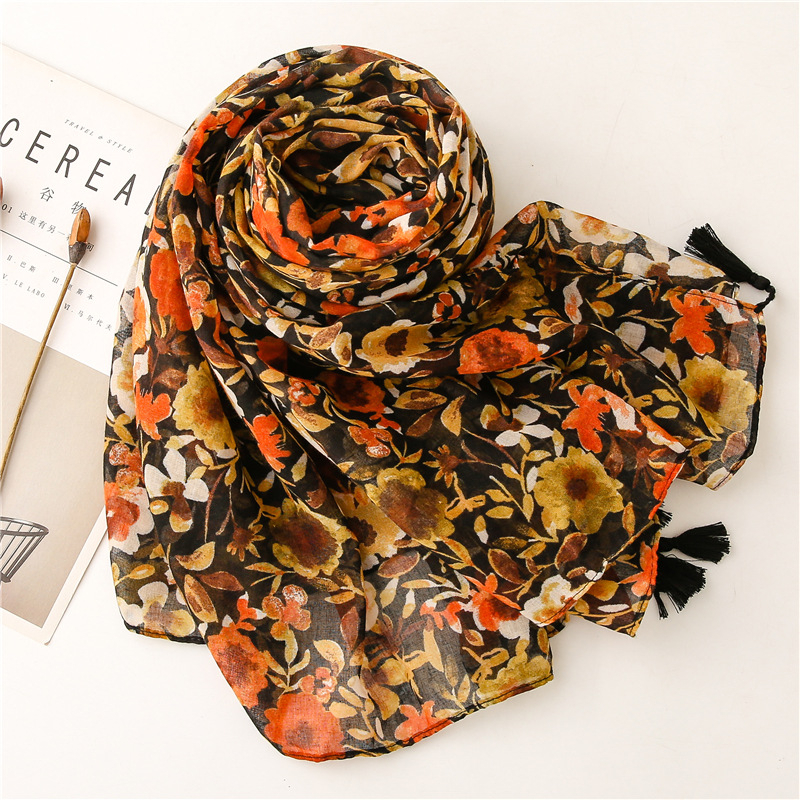 Foulard écharpe en coton et cashmere fleuri orange
