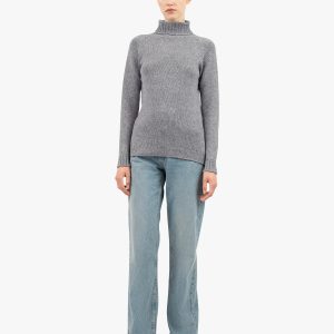 This sweater, crafted in fisherman’s rib from extra fine merino and cashmere yarn, stands out for its distinctive features: a raised collar, raglan sleeves, and side seams ending at the front in slits framed by an elegant openwork detail. Perfect for casual wear.