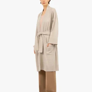 The most coveted robe for relaxing moments at home. Meticulously finished, from the double-knit shawl collar to the flat trims along the hem and cuffs. Featuring practical patch pockets and a matching belt threaded through discreet side loops. Refined and elegant, thanks to its natural pure cashmere knit.