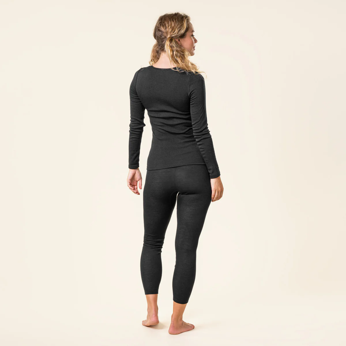 Ce maillot à manches longues allie chaleur et élégance grâce à un mélange luxueux de 70% laine mérinos et 30% soie biologique, offrant un confort doux et enveloppant pour les journées les plus fraîches. Sa coupe féminine avec un col en V, délicatement bordé de fine dentelle, apporte une touche subtile de raffinement.