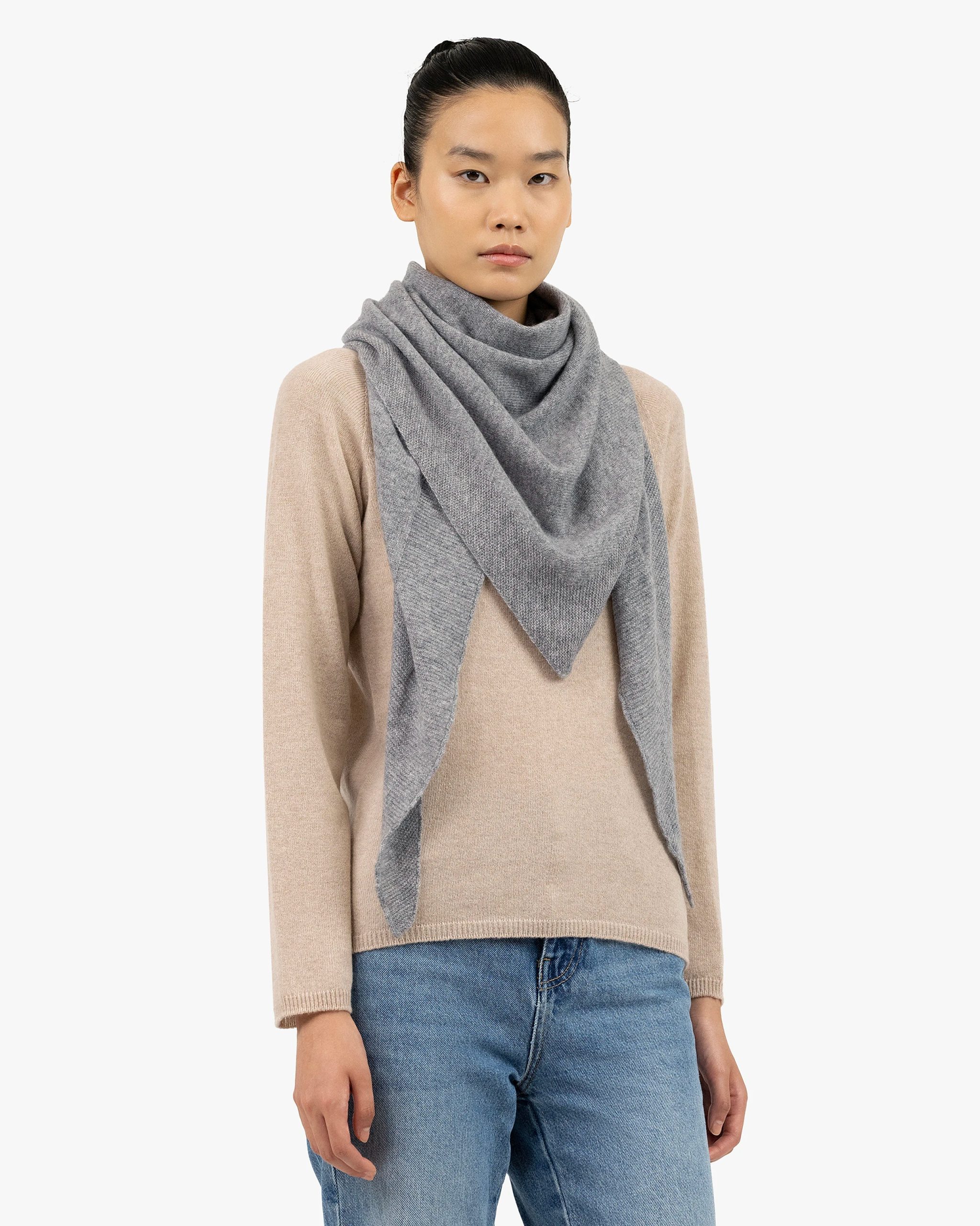 This maxi triangle scarf is a truly distinctive accessory, thanks to its generous size, clean design, and the warmth it provides when wrapped around the shoulders. Its natural pure cashmere yarn adds an extra touch of elegance.