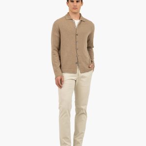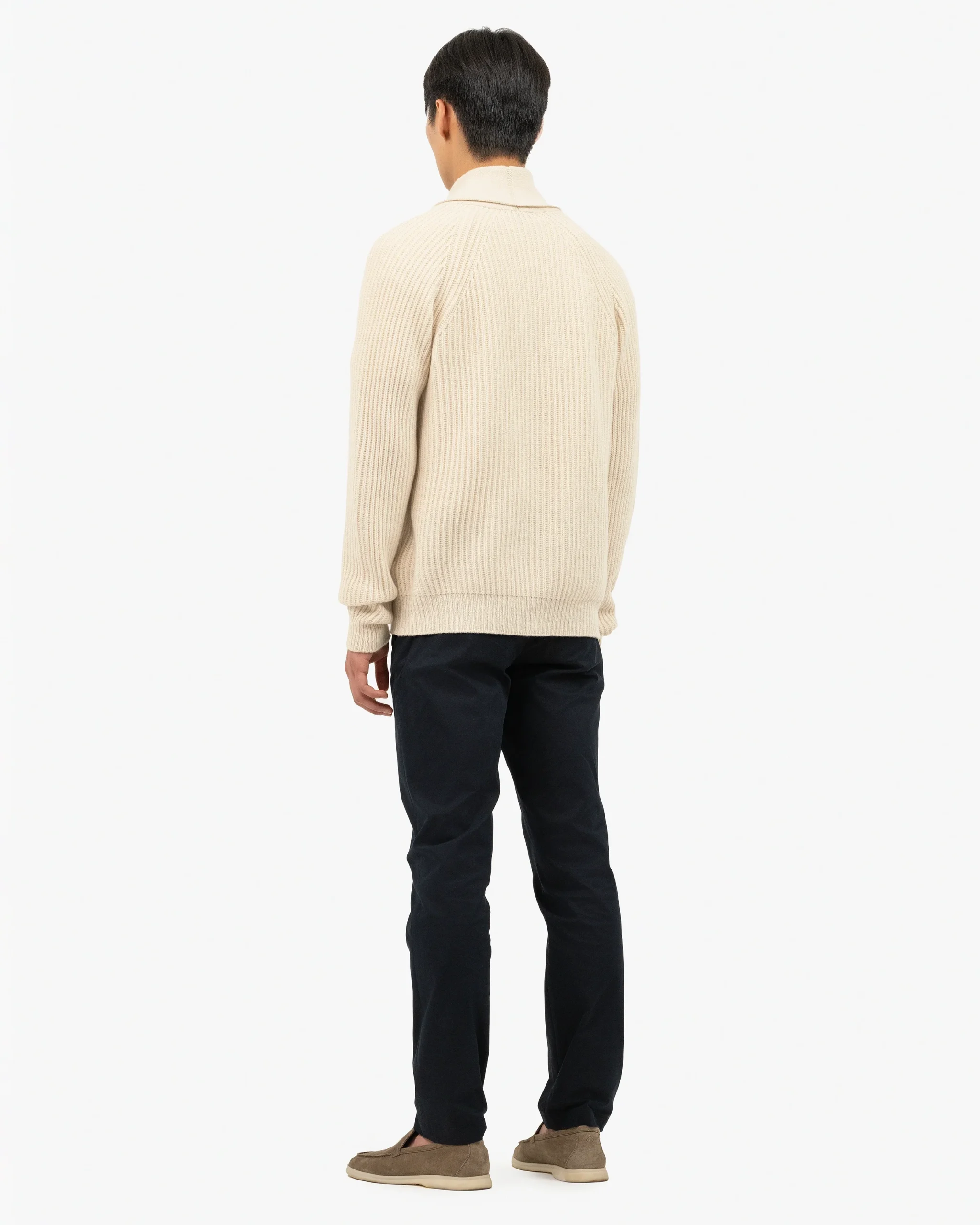This pure cashmere blazer, extremely soft and warm, is something both essential and unique. Carefully crafted in fisherman’s rib stitch, its shawl neck and button band are plain knit and accented by genuine horn buttons. Something we think you’ll love is the motif that runs along this sweater’s raglan cut sleeves and its slightly elastic cuffs which will fit perfectly around your wrists without ever stretching out.
