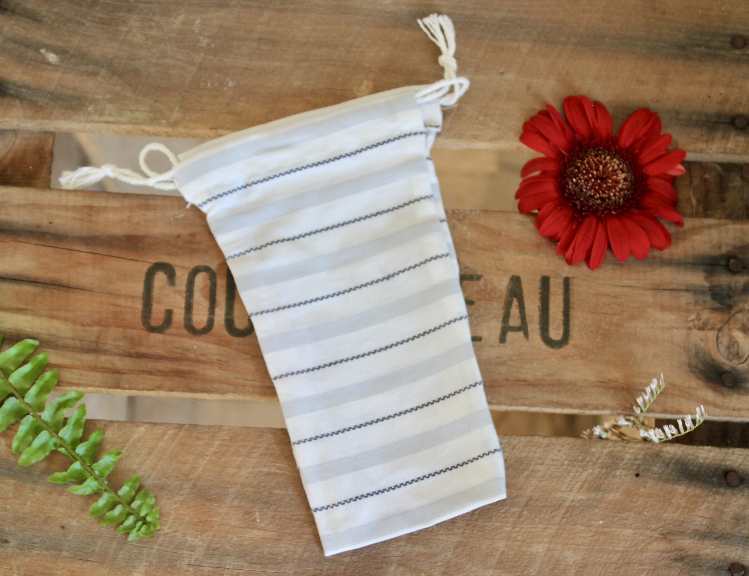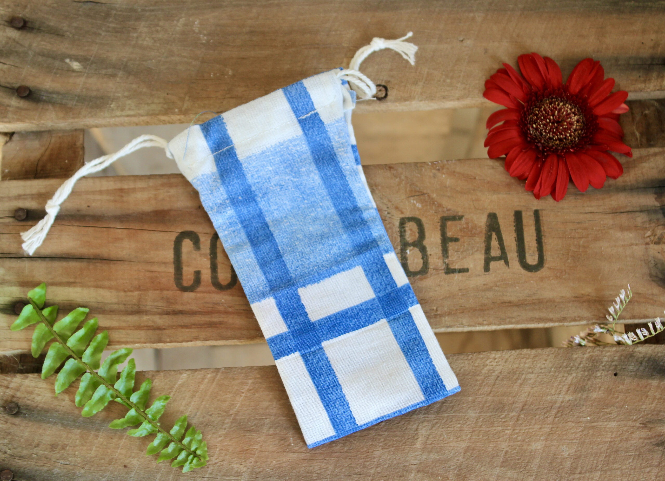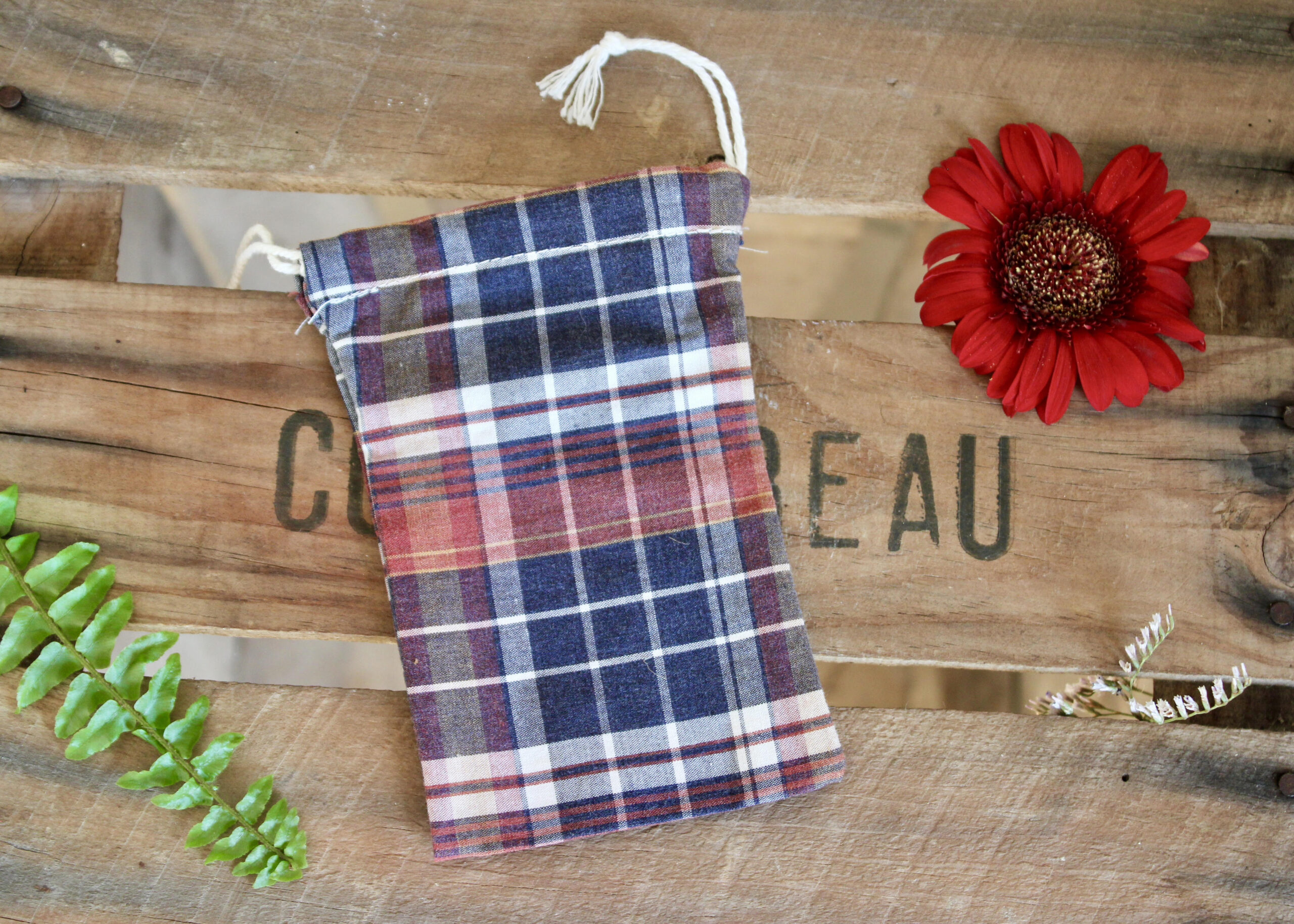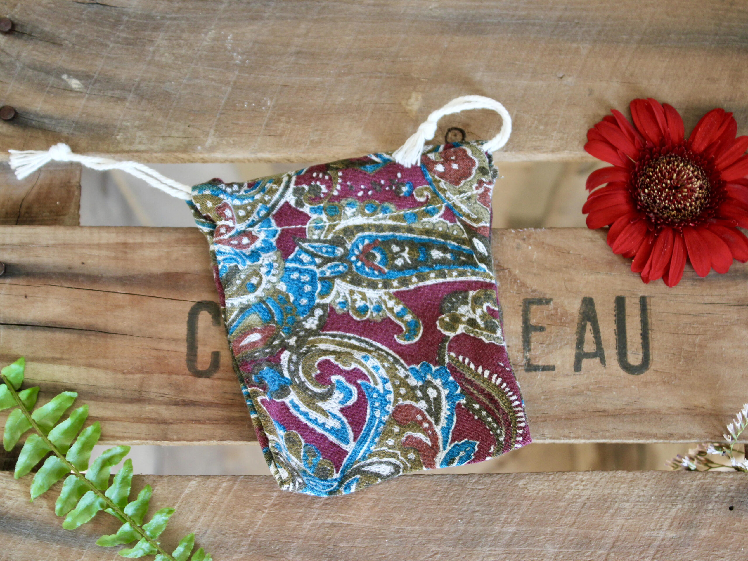 Matière : Tissus upcyclé, normalement destinés à être jetés + cordon en coton.