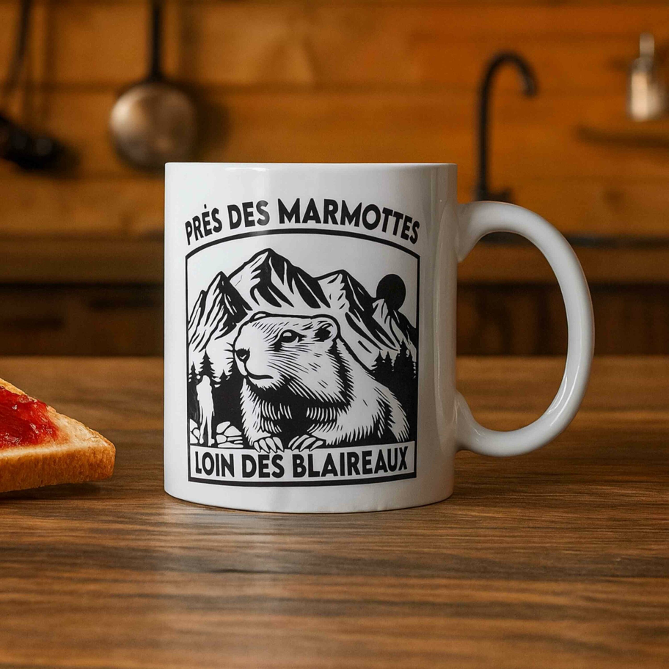 Découvrez notre mug savoyard Près des marmottes loin des blaireaux, le compagnon parfait pour savourer votre boisson préférée avec élégance et style !