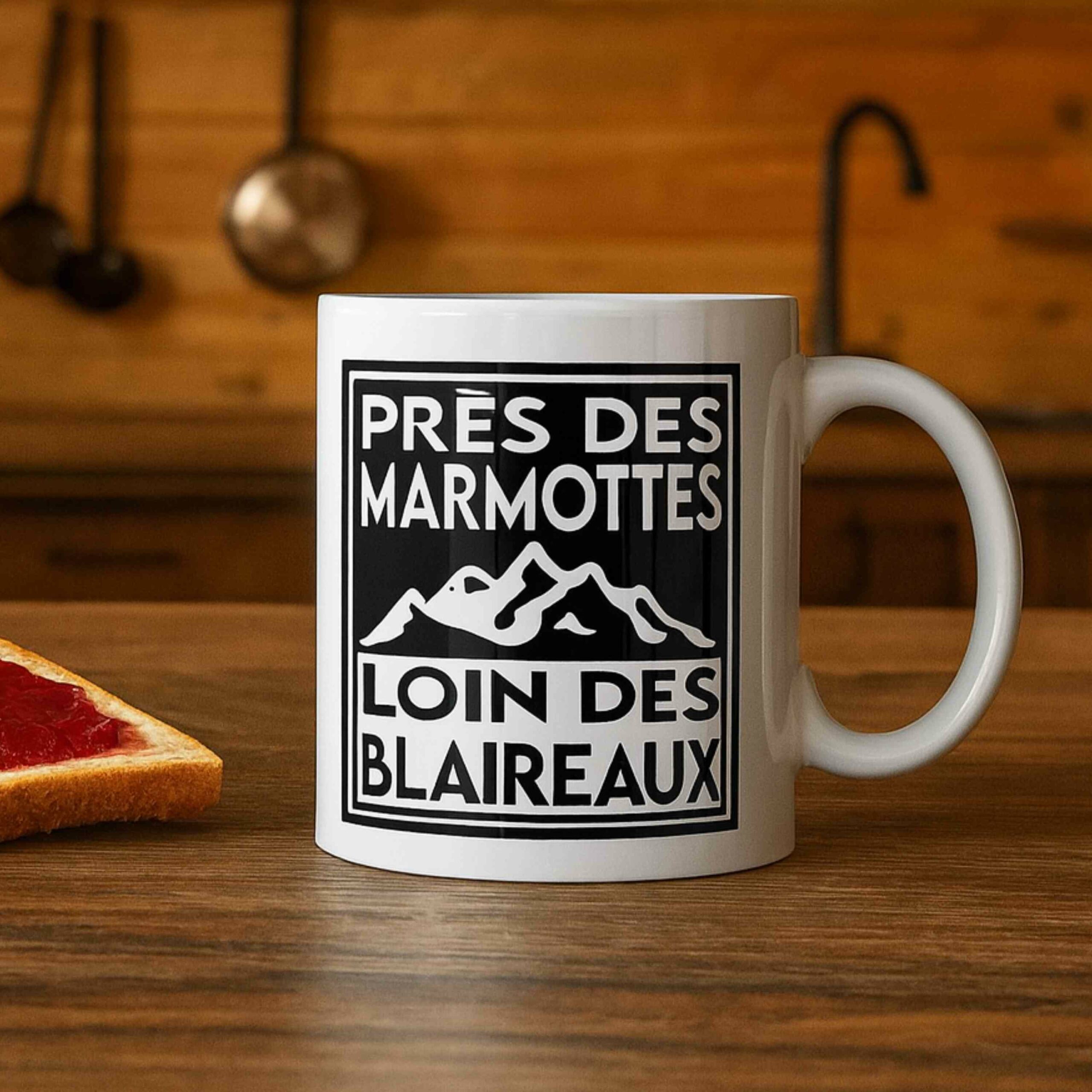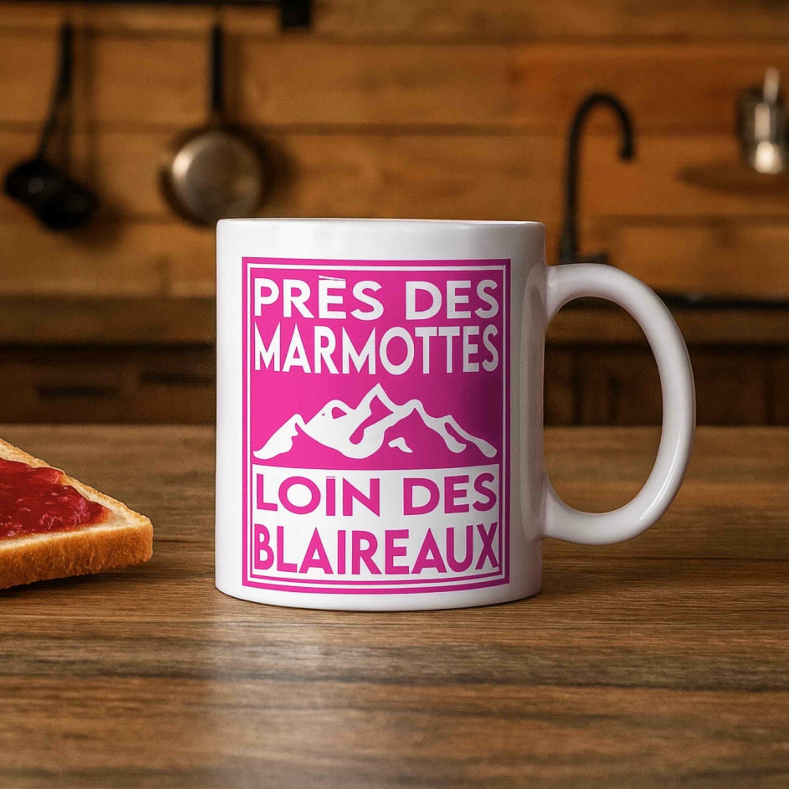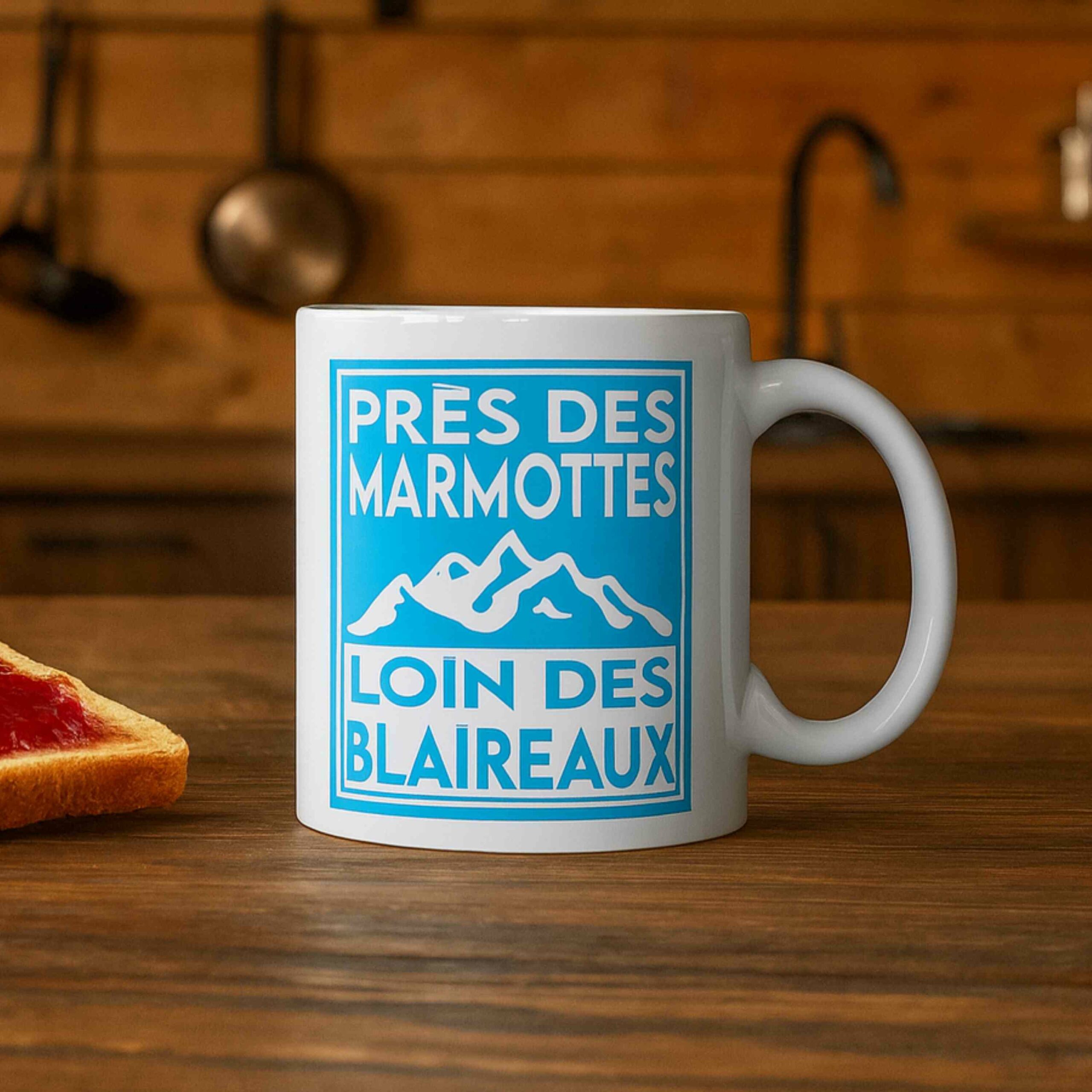 Découvrez notre mug savoyard Près des marmottes loin des blaireaux, le compagnon parfait pour savourer votre boisson préférée avec élégance et style !