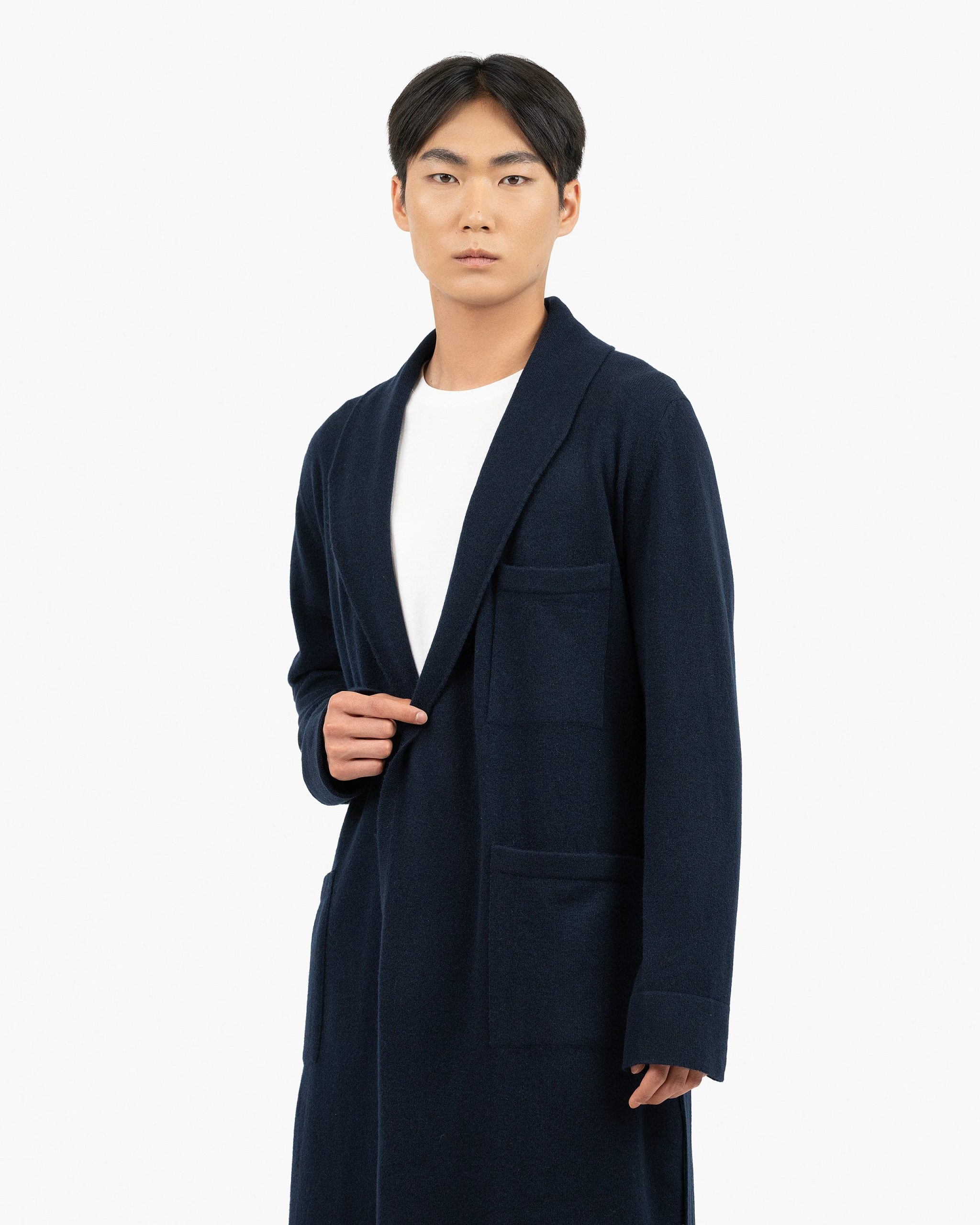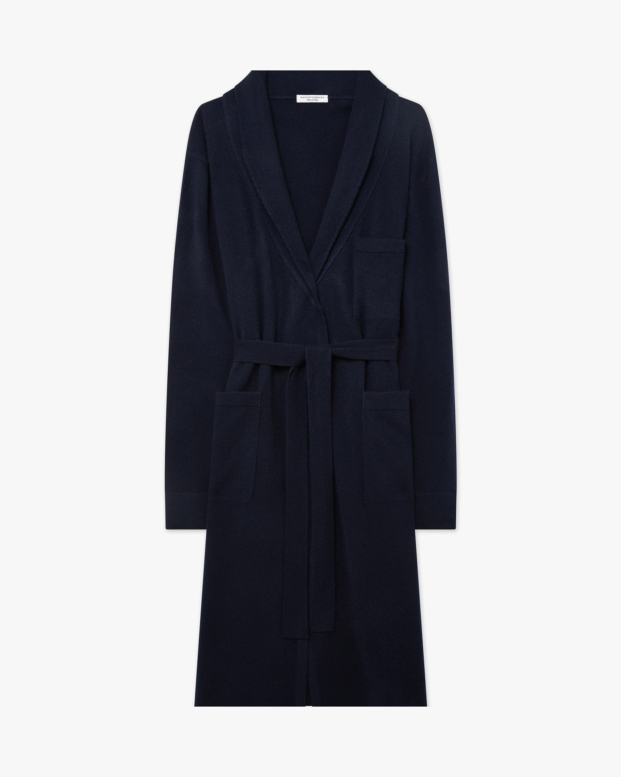 The most coveted robe for your moments of relaxation at home. Carefully crafted, it features a double-knit shawl collar, flat trims along the hem and cuffs, practical patch pockets, and a matching belt threaded through discreet side loops. Refined and luxurious, thanks to its natural pure cashmere yarn.