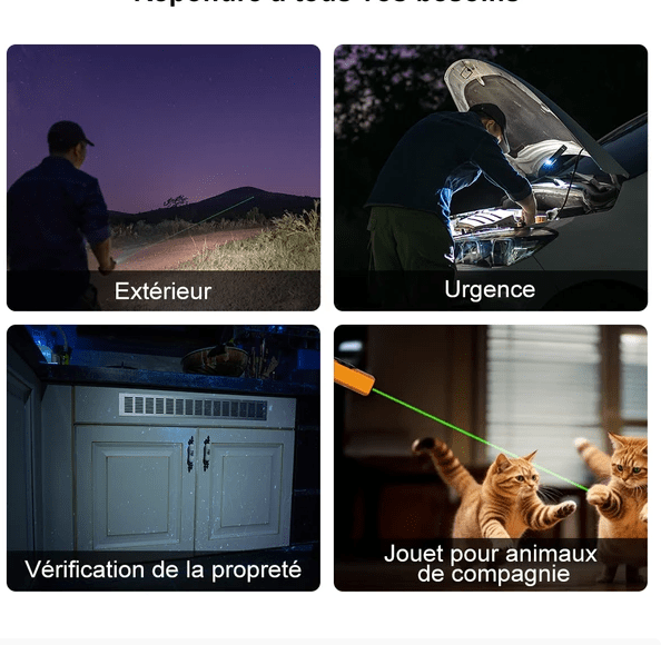 - Lumière Blanche et Laser Vert Professionnels : la lumière blanche pour l’éclairage quotidien et le laser vert pour s’amuser, désigner un objectif ou faire une présentation. De plus, la lumière blanche et le laser vert peuvent fonctionner en même temps pour fournir un éclairage tout en verrouillant un point ciblé.