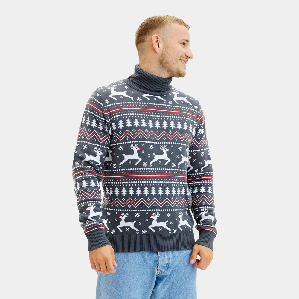 Pull de Noël pour Homme à Col Roulé Gris Rennes Coton Bio