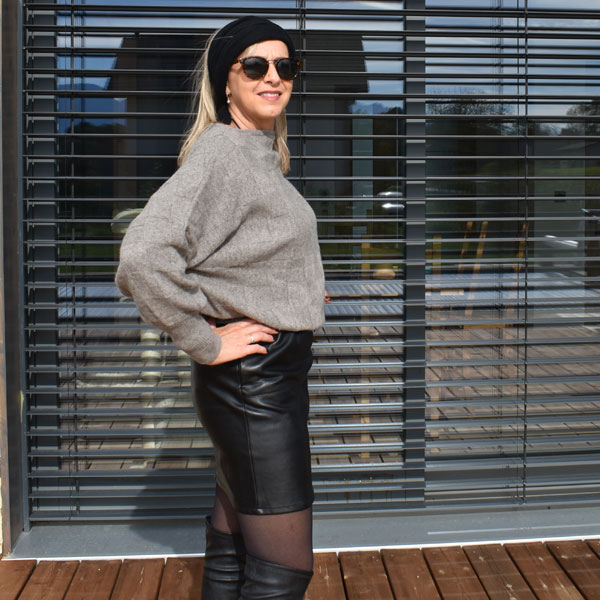 Pull en laine de yack femme – 100% duvet de yak. Modèle moderne avec des manches chauve-souris. Matière en laine très douce et confortable. Couleur naturelle gris beige, sans teinture chimique. Idéal pour les périodes froides et hivernales.