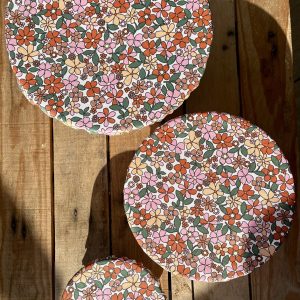 | Motifs | Beige à feuilles, Carreaux, Eventail rose et bleu, Fleurie orange, Mandala, Marron, Oiseau, Radis, Terra cotta |