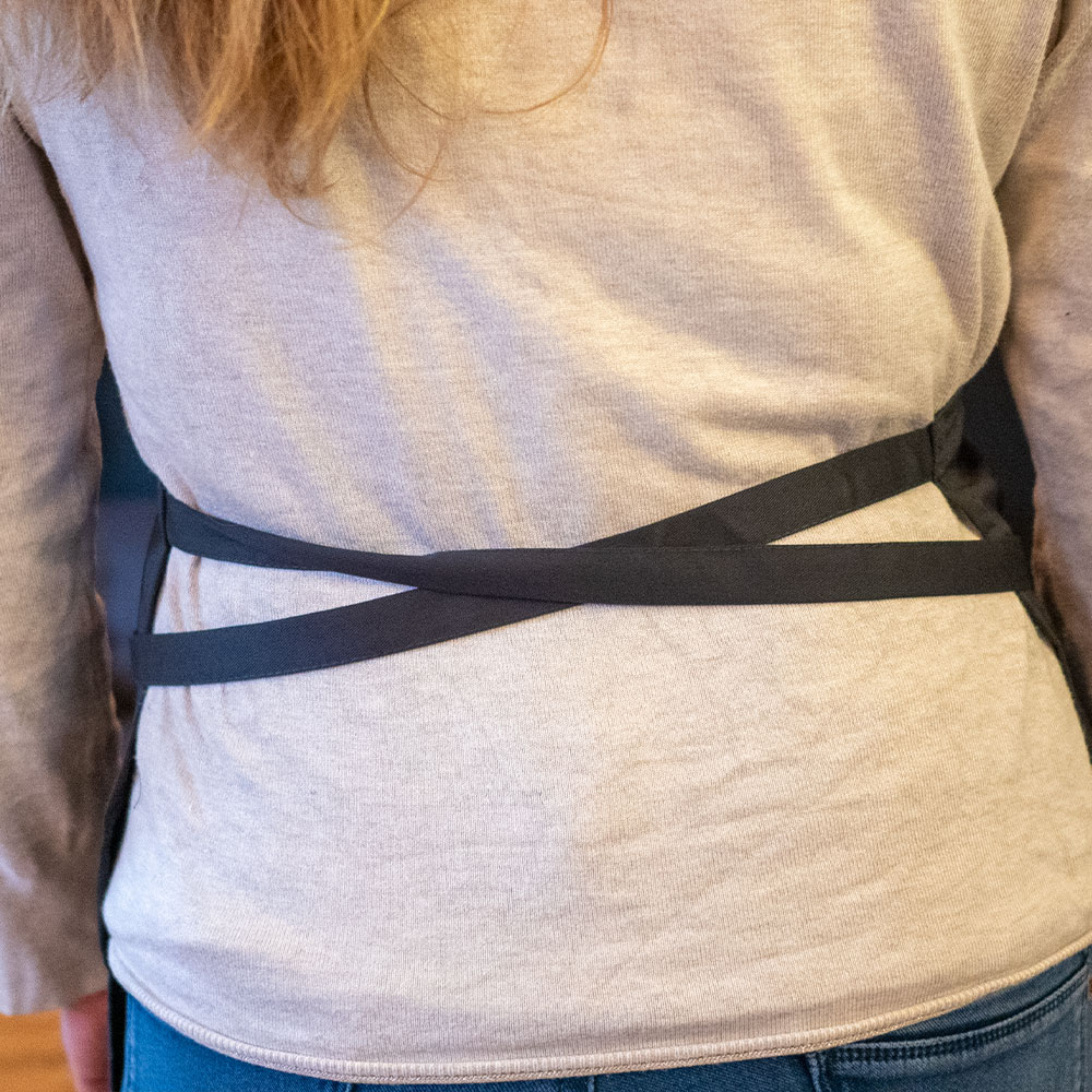 - Tablier long avec cordon réglable autour du cou et cordons latéraux.