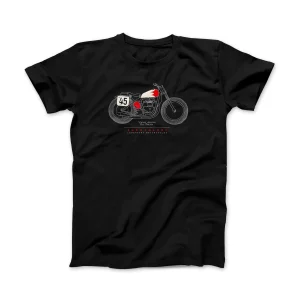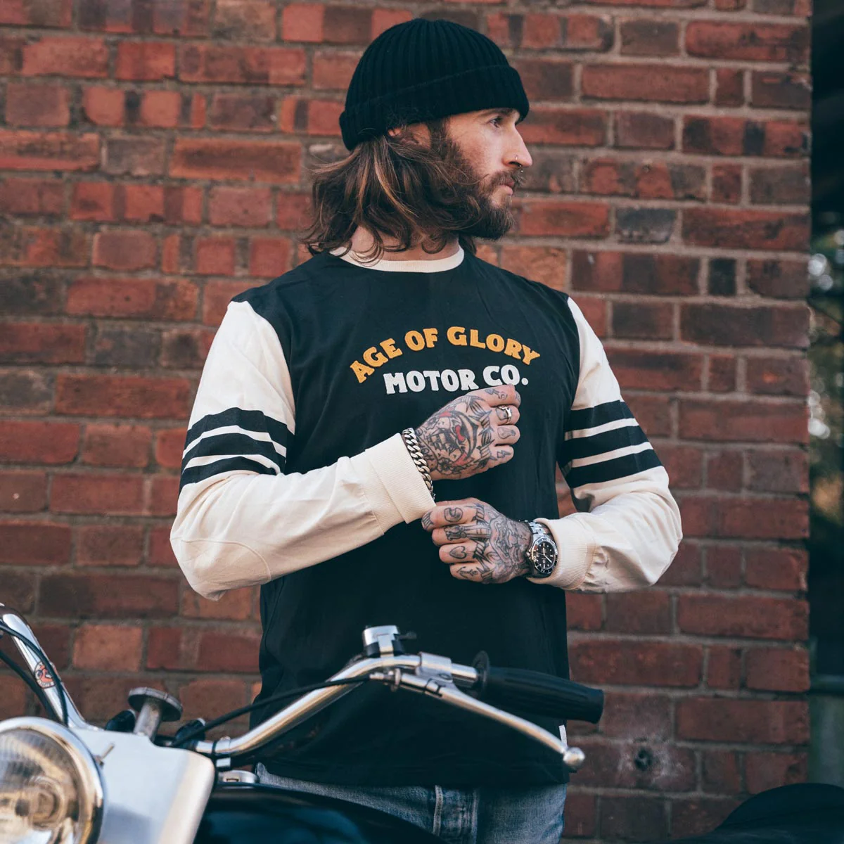 Vous êtes prêt pour la course… Le niveau d’huile et la pression des pneus sont vérifiés… L’essence aussi… Ajustez simplement votre casque et vos lunettes, et c’est parti ! Mais pas de pression car il s’agit de s’amuser ! Ces vieilles motos doivent être manipulées avec tact et surtout avec style ! Vous êtes en charge du pilotage, et nous vous aidons pour la tenue avec ce t-shirt à manches longues dans l’esprit des maillots qui étaient portés par les coureurs amateurs de course du désert des années 70.