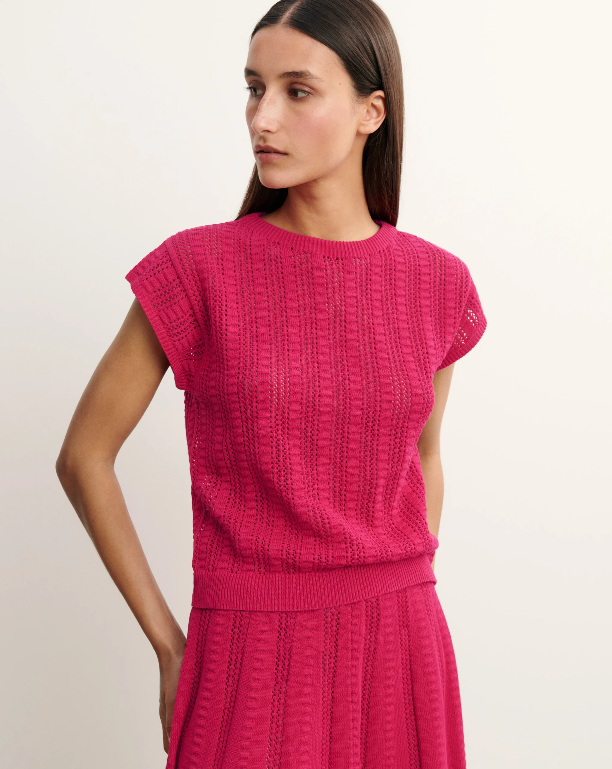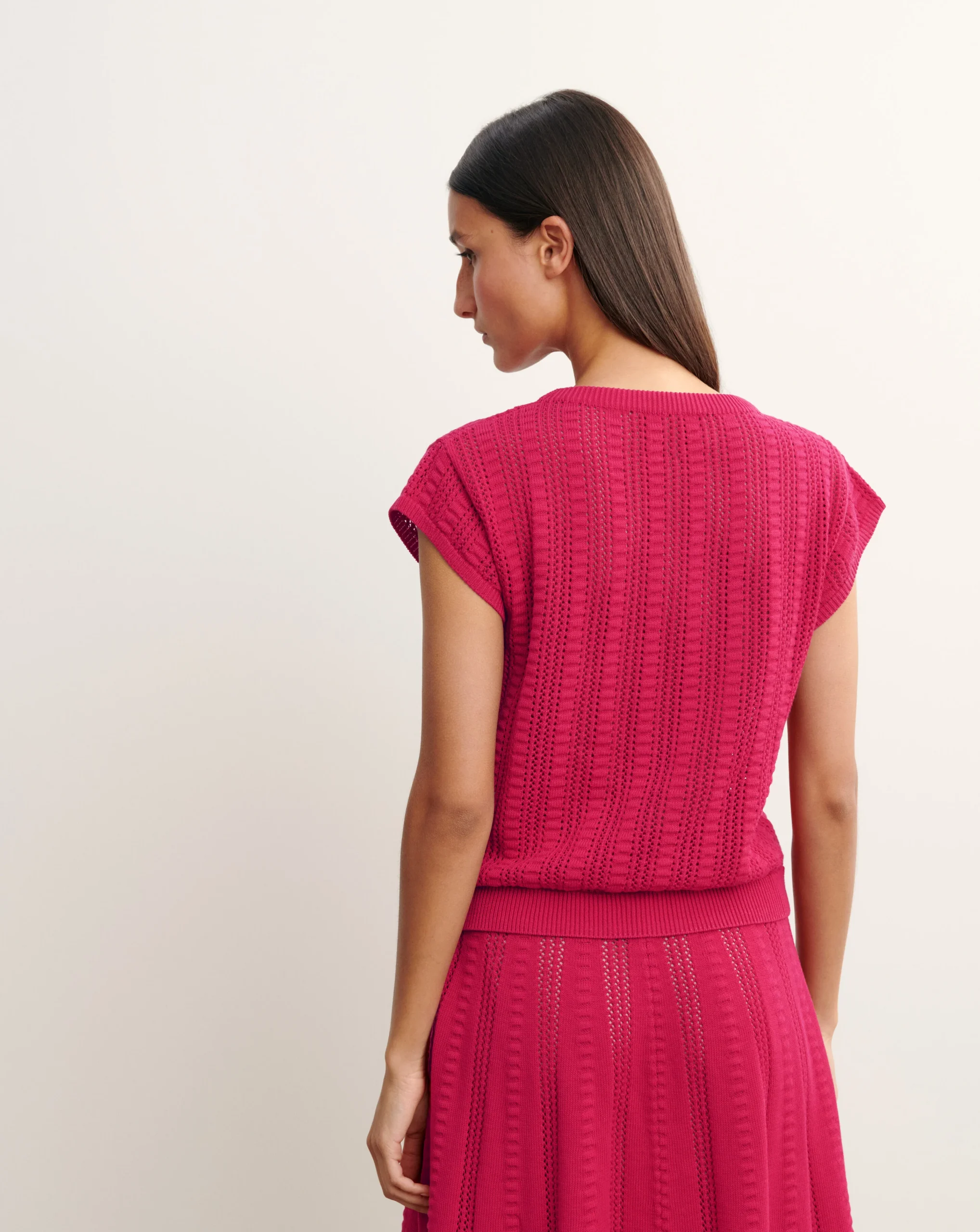Top à col bouton réalisé en maille de coton bio, enrichie d’une touche de soie. Modèle à coupe droite et manches courtes, orné d’un motif ajouré.