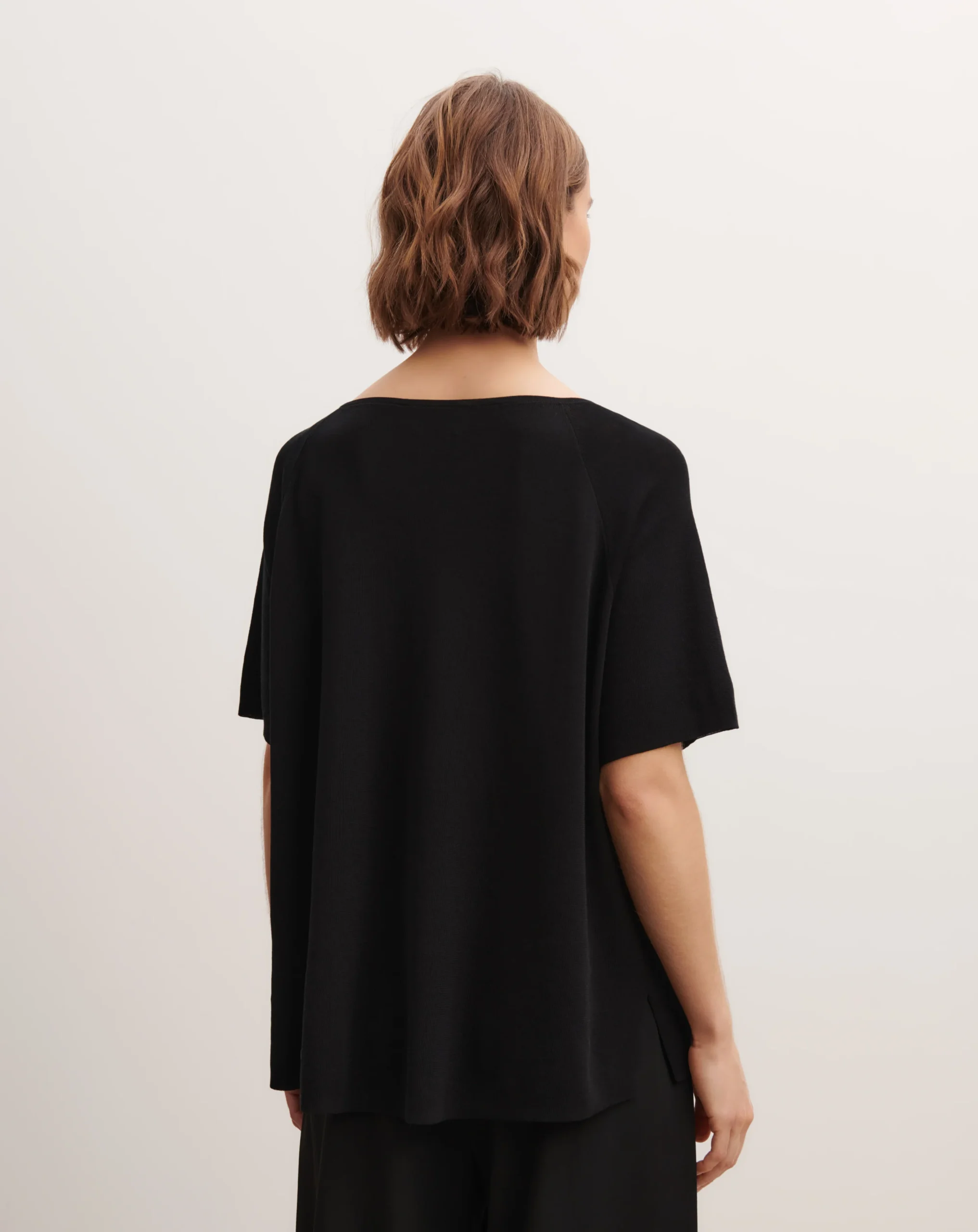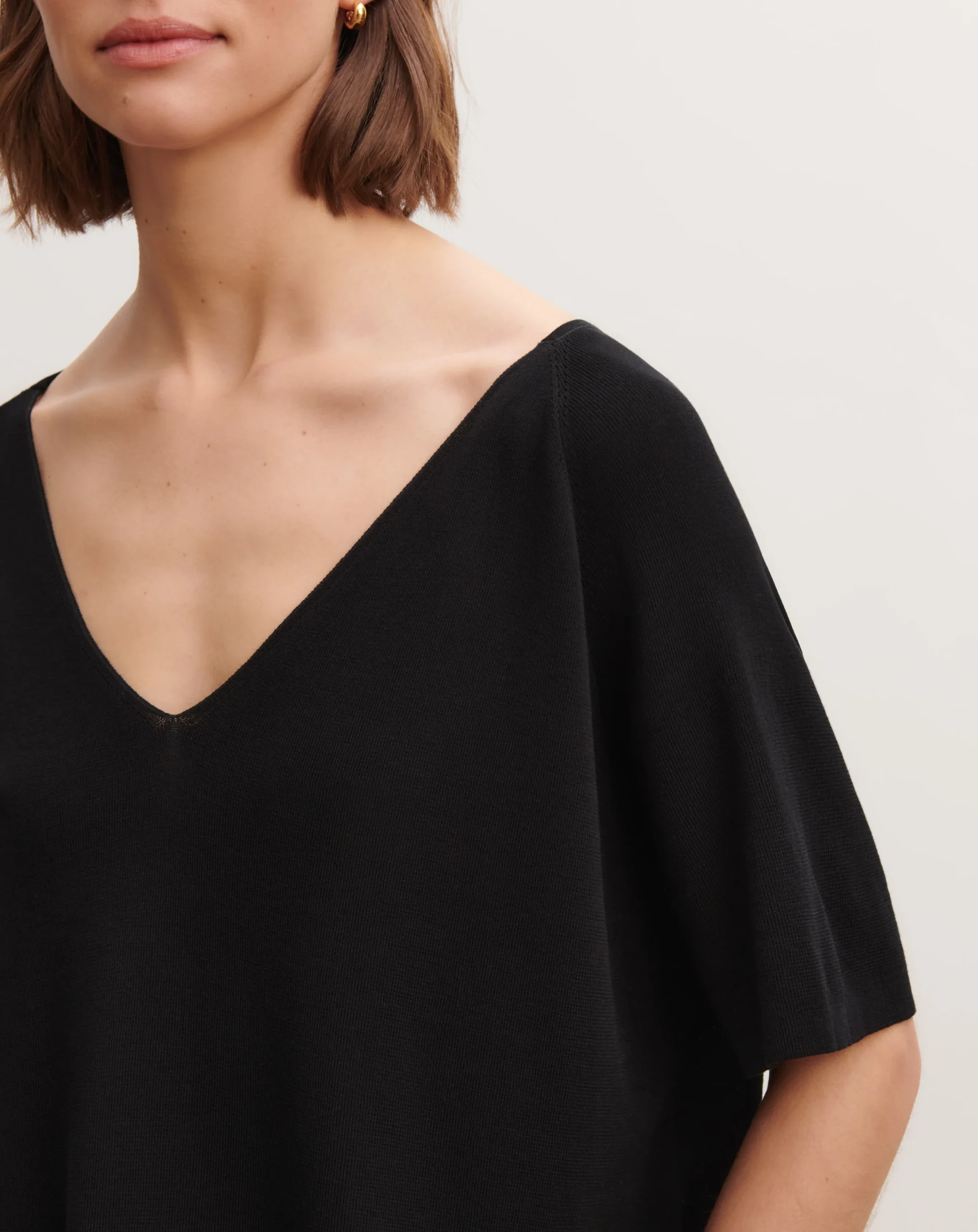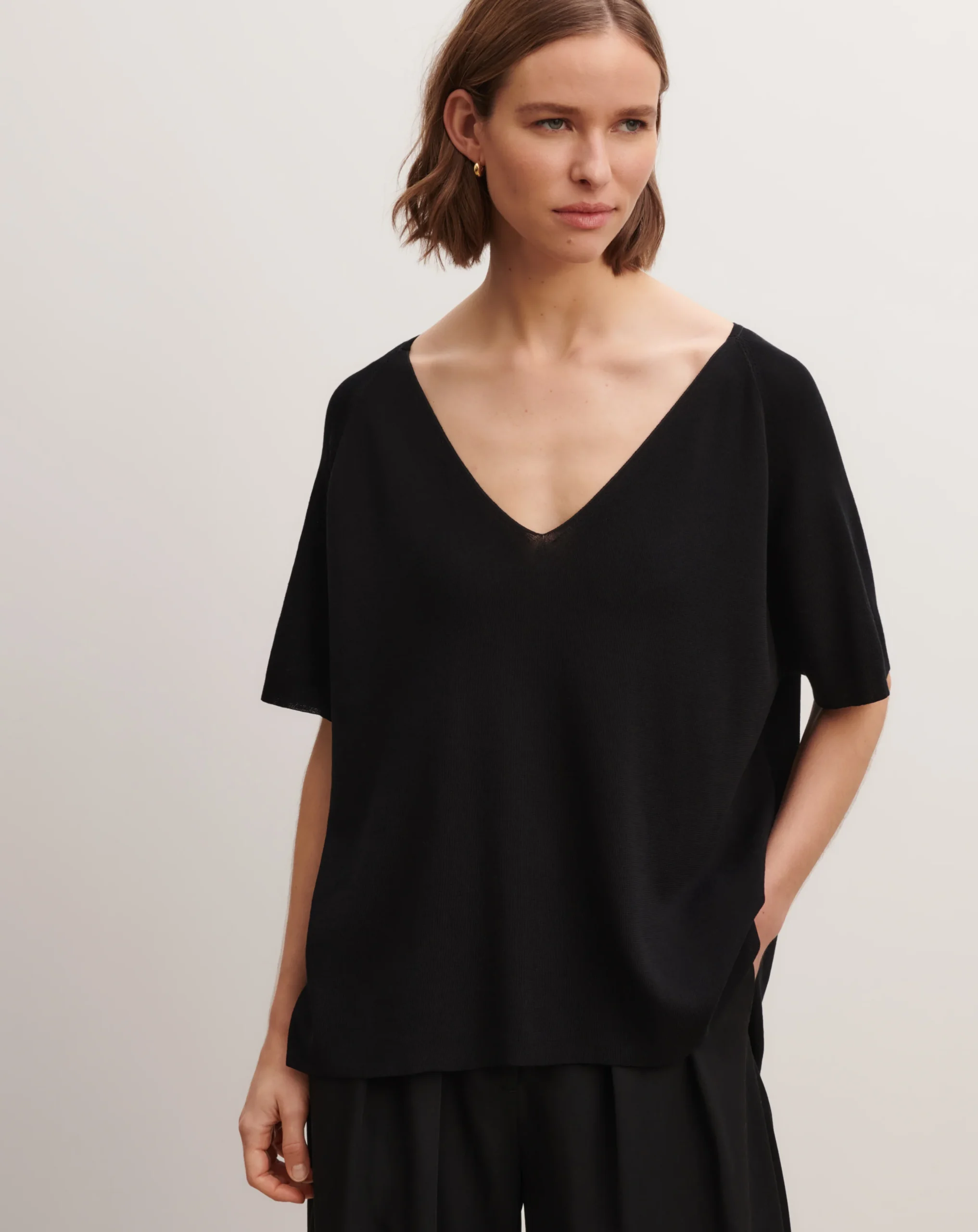 Top à manches courtes en maille de coton. Modèle à col V et coupe oversized.