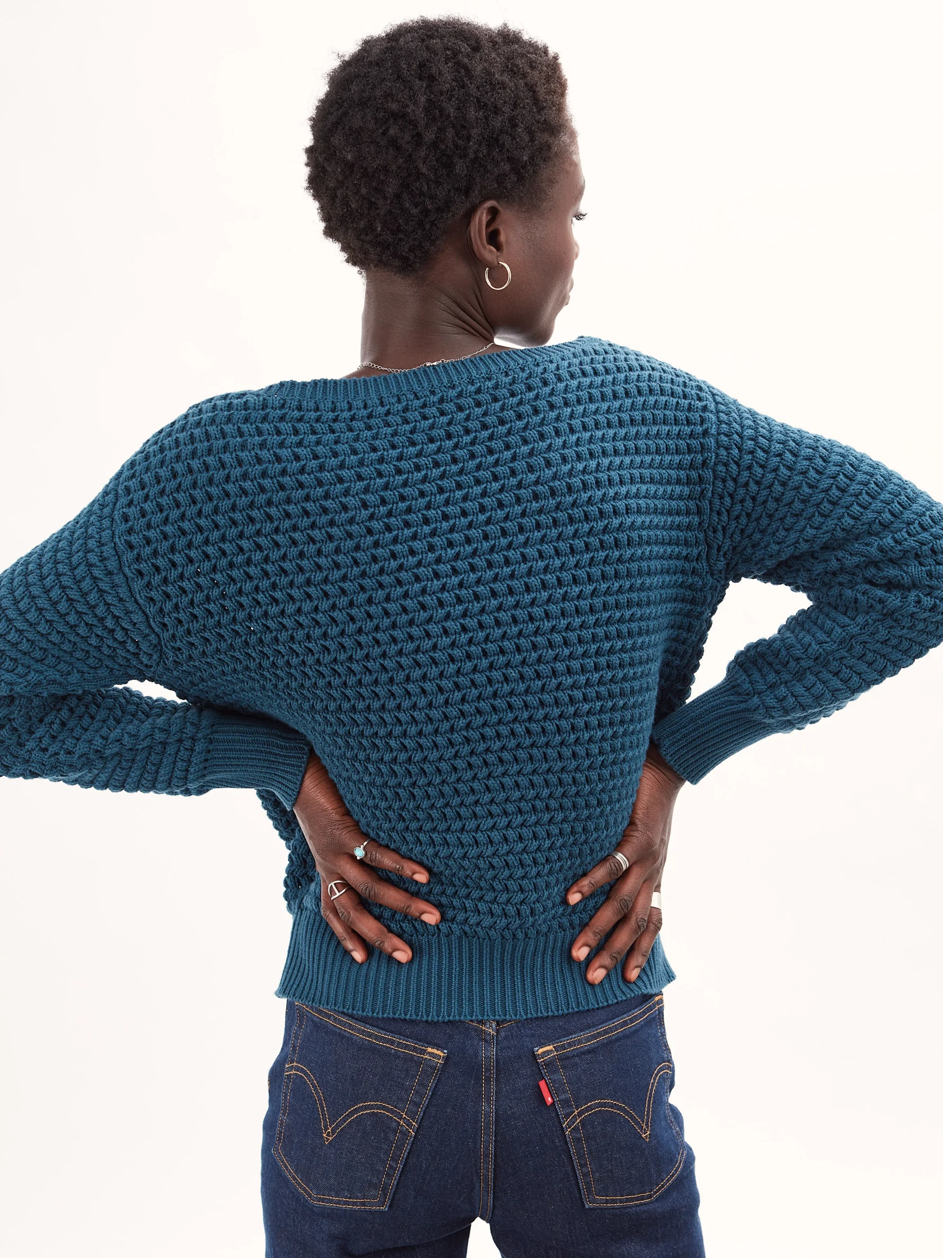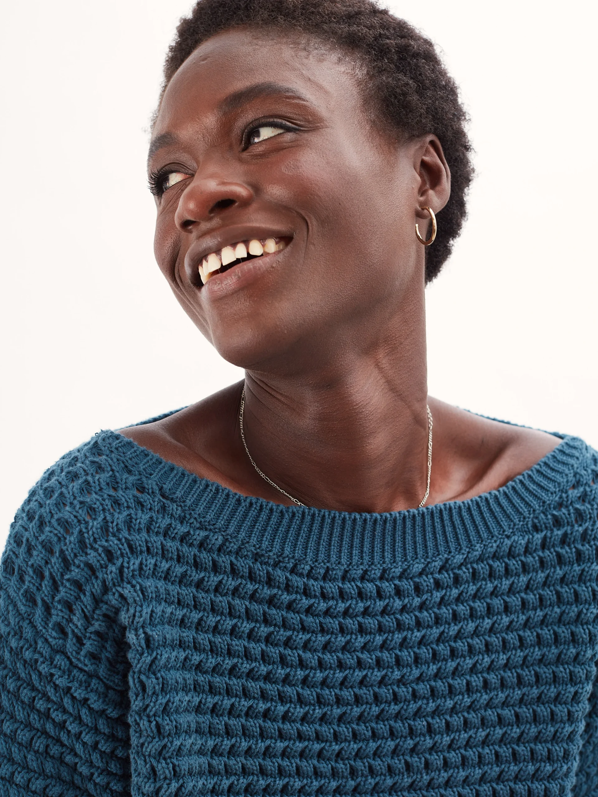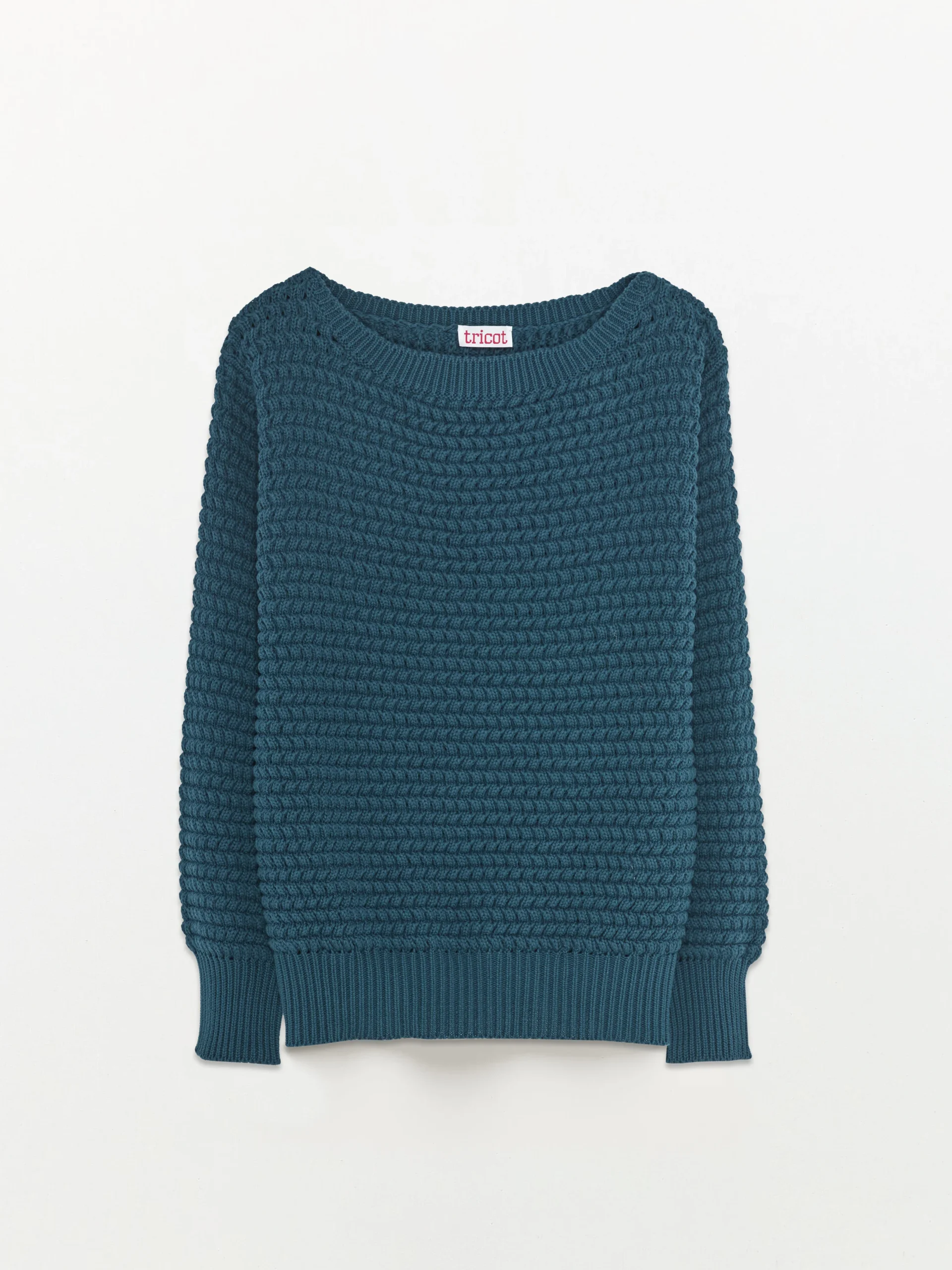 Knitted in a beaded knit, the Bleu boat neck sweater from Tricot is an essential in your wardrobe.