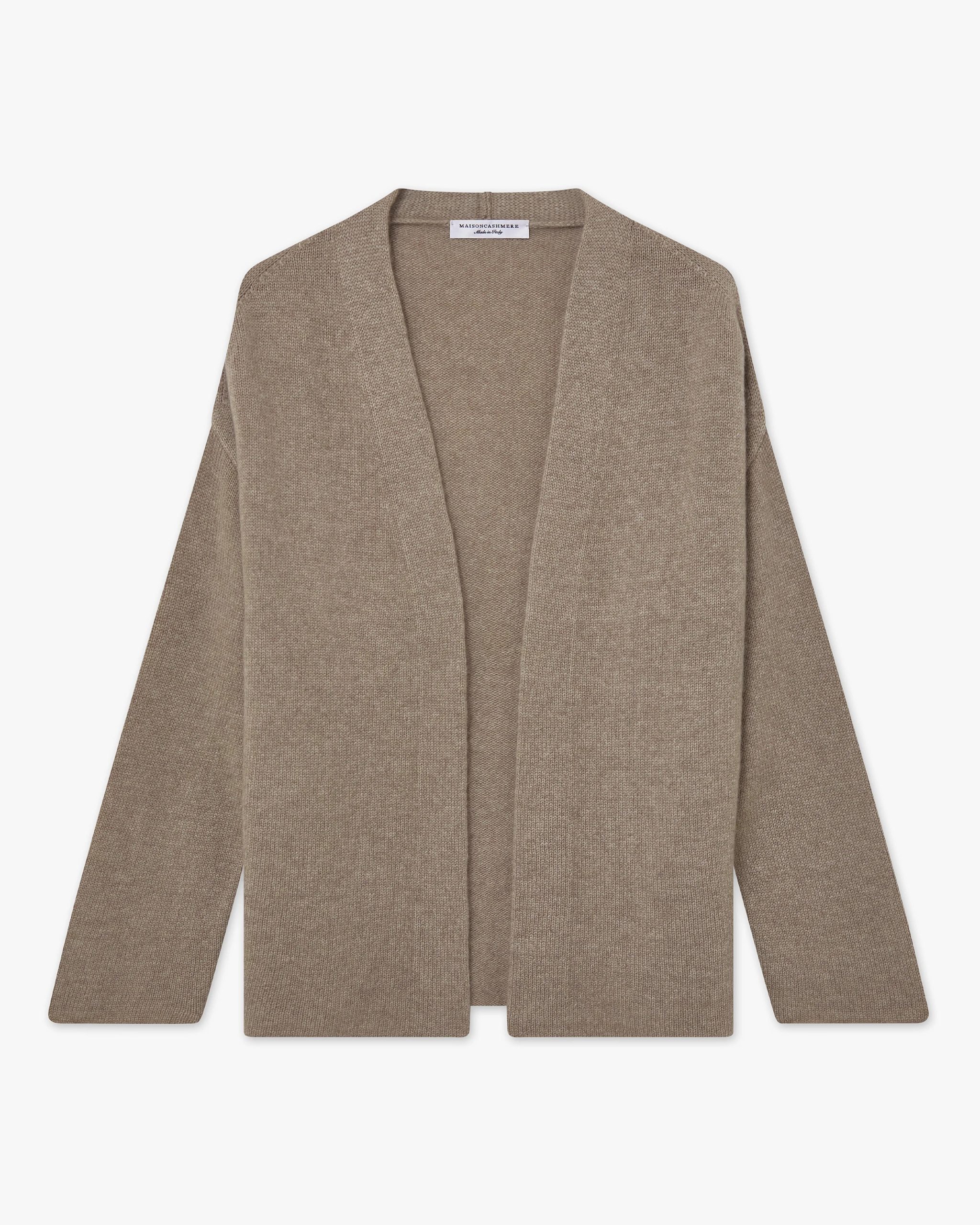 Casual-style cardigan jacket, ideal for everyday wear. Open front with no fastening, finished with a wide flat trim running along the entire edge. Crafted in a high-thickness knit, it offers exceptional softness and enveloping warmth, perfect for colder seasons.