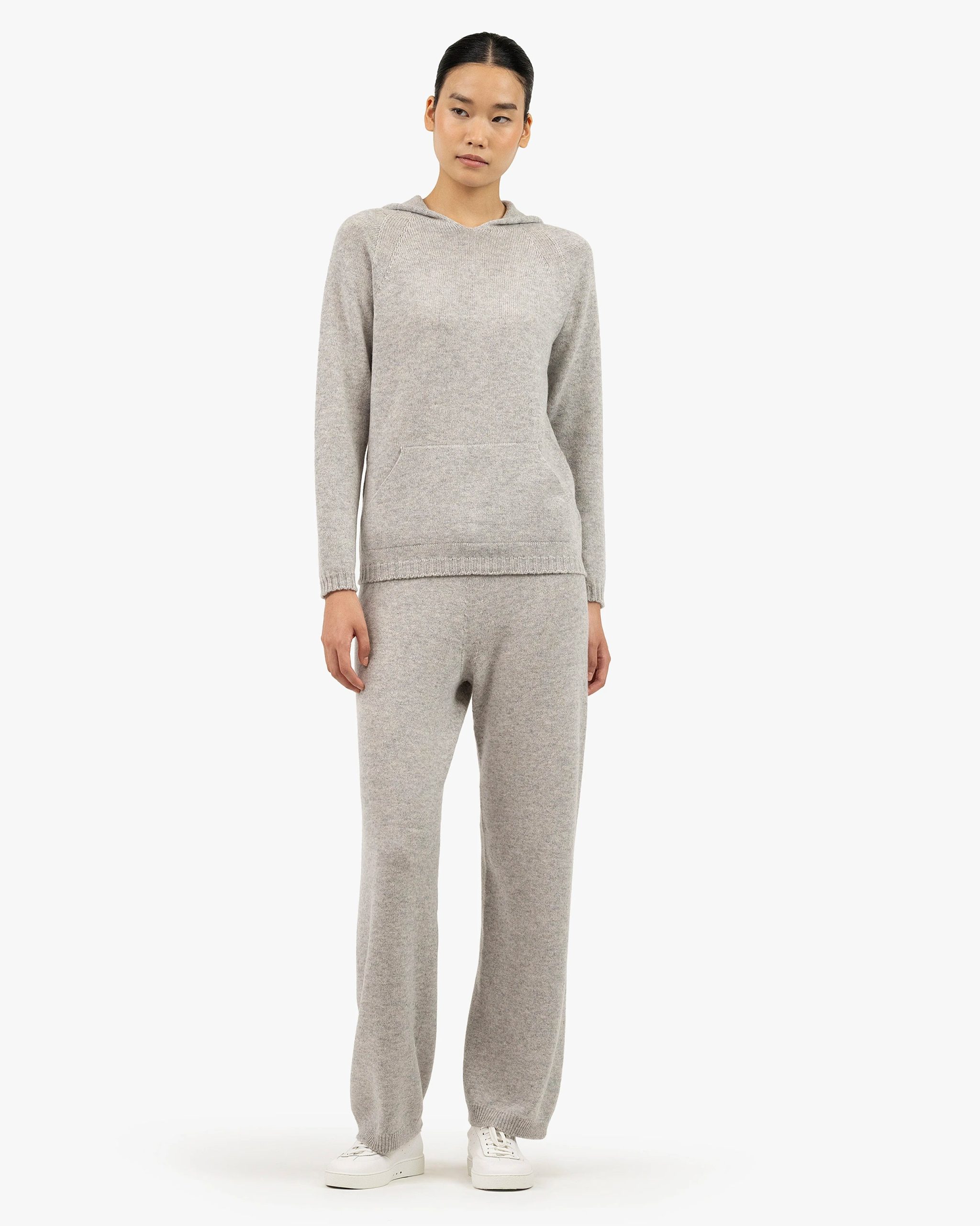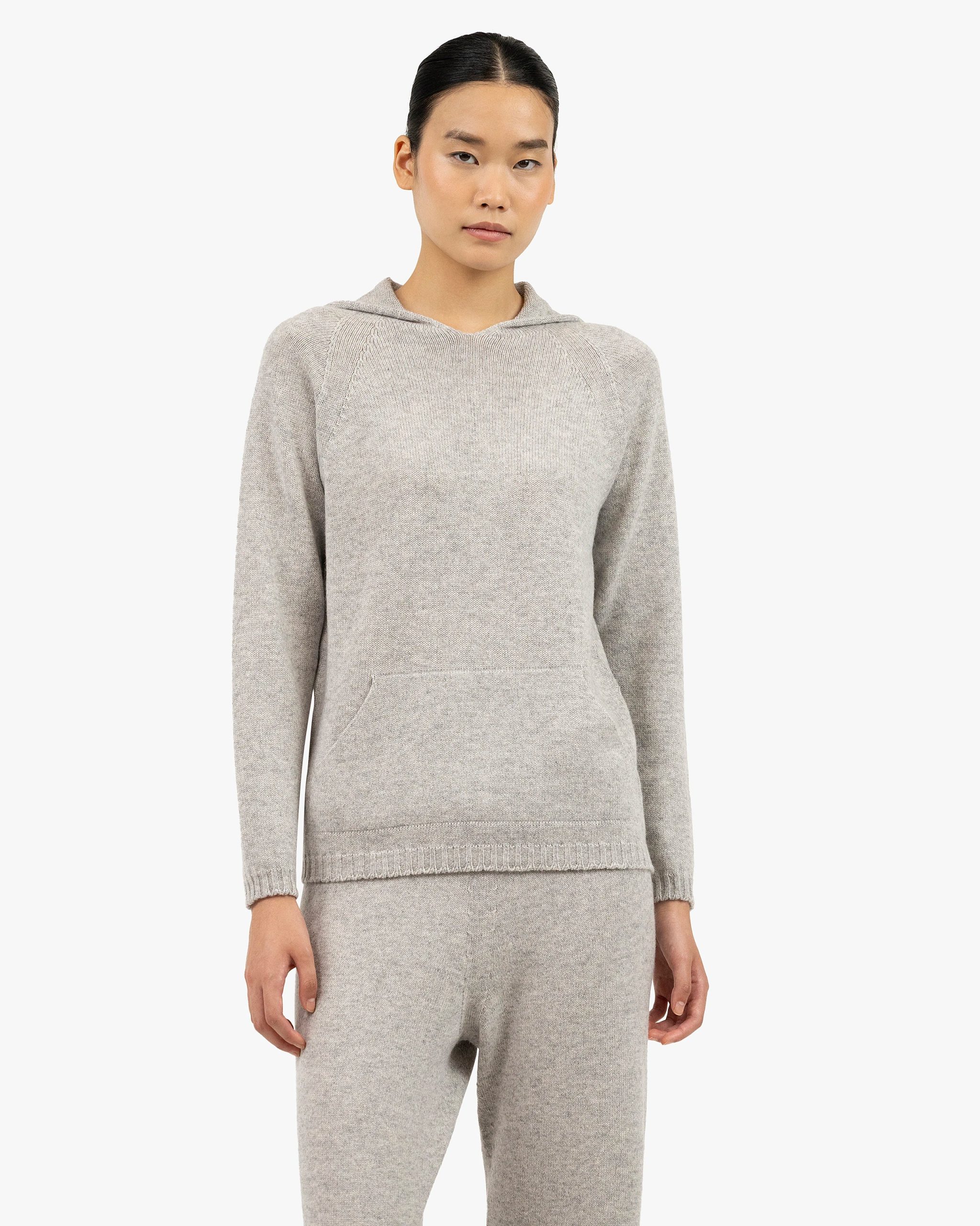 The classic hoodie design is elevated by its pure cashmere yarn; practical yet refined, it stands out for the well-defined raglan sleeves, the absence of side seams, and the understated elegance of its lightweight, raw-edge hood. Finished with subtle ribbed trims at the cuffs and hem, it also features a front pocket.