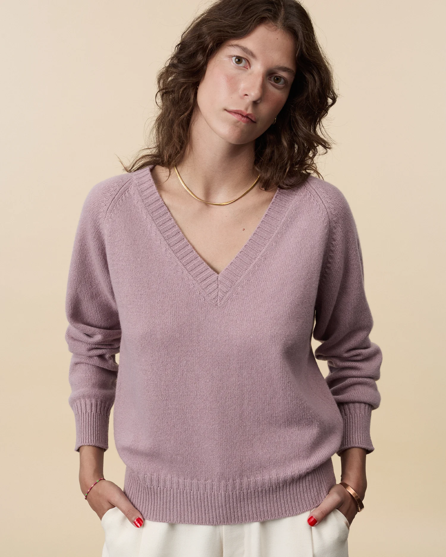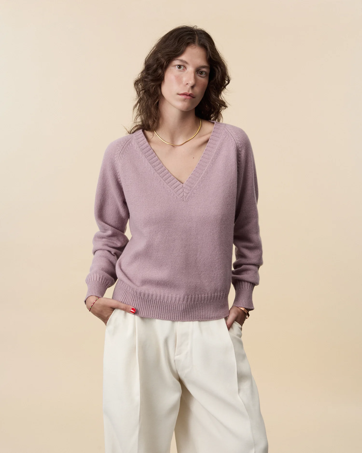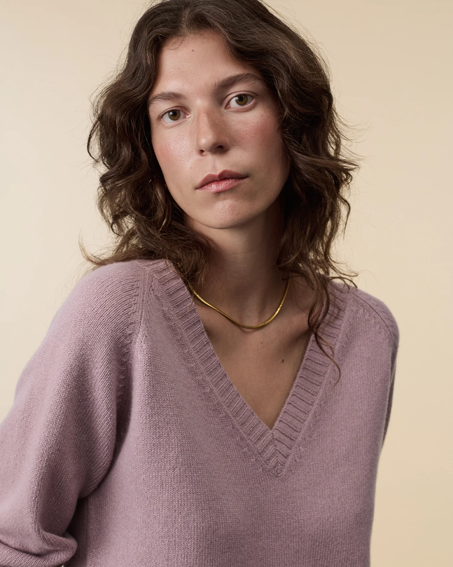 Knitted in dense yet soft cashmere, the deep V‑neck elevates a timeless essential with its oversized fit and boxy volume. A clean silhouette that flatters every shape, it balances relaxed ease with refined elegance. Built to endure, it unites comfort and modernity in an effortless staple.
