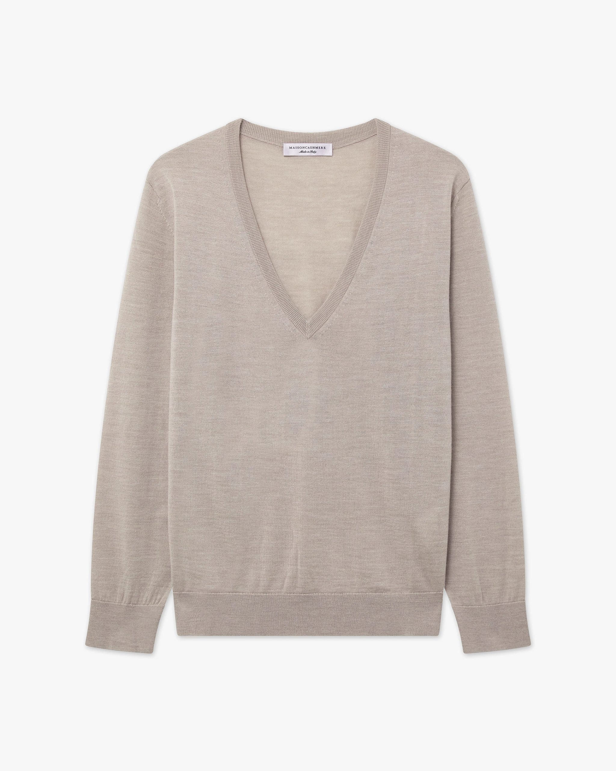 This deep V-neck sweater, crafted in 18-gauge fine merino wool, strikes the perfect balance between sensuality and sophistication. Its lightweight knit enhances the premium quality of merino wool, offering a soft and delicate feel against the skin. The plunging neckline adds a feminine touch, ideal for a modern, elegant look.