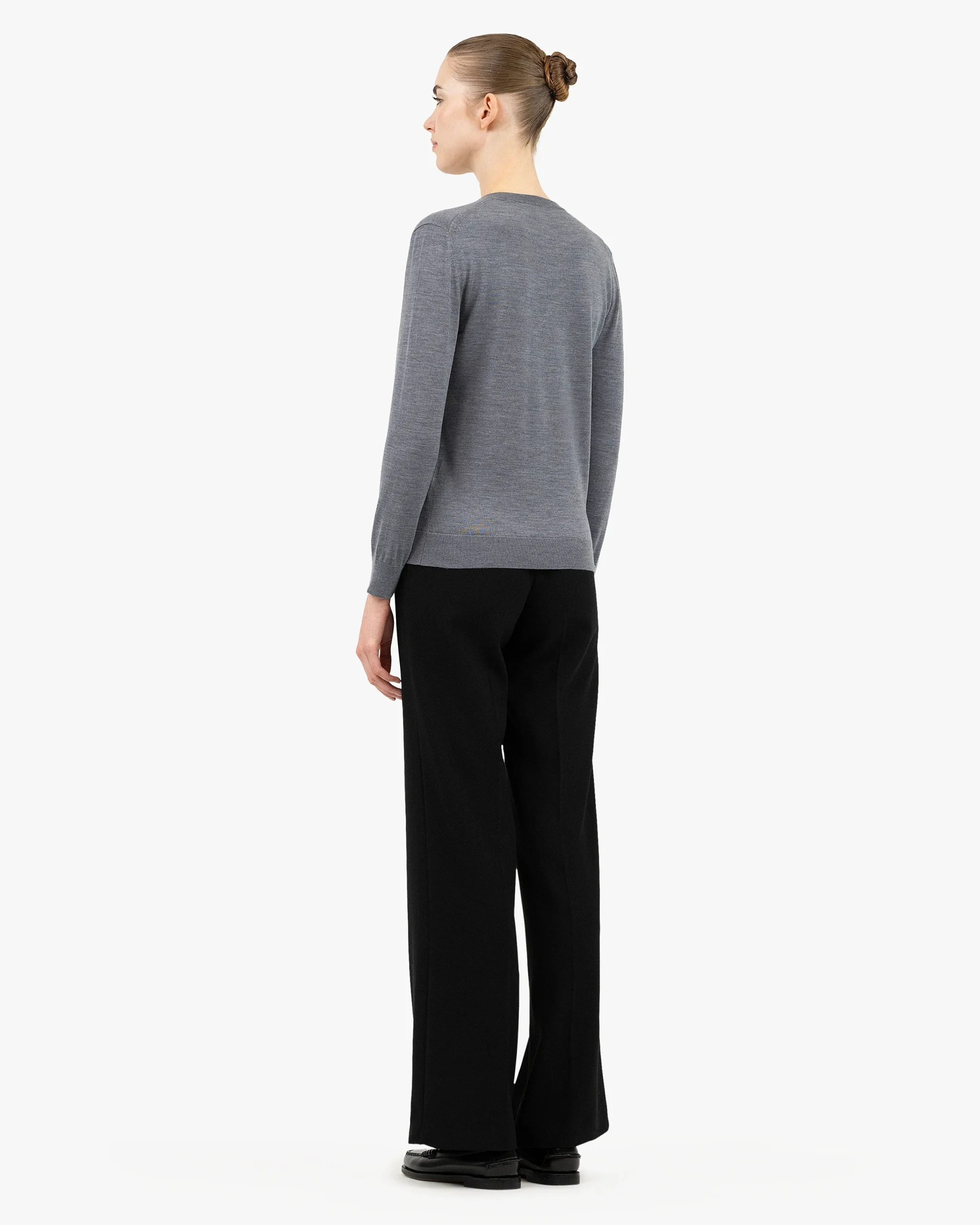 This deep V-neck sweater, crafted in 18-gauge fine merino wool, strikes the perfect balance between sensuality and sophistication. Its lightweight knit enhances the premium quality of merino wool, offering a soft and delicate feel against the skin. The plunging neckline adds a feminine touch, ideal for a modern, elegant look.