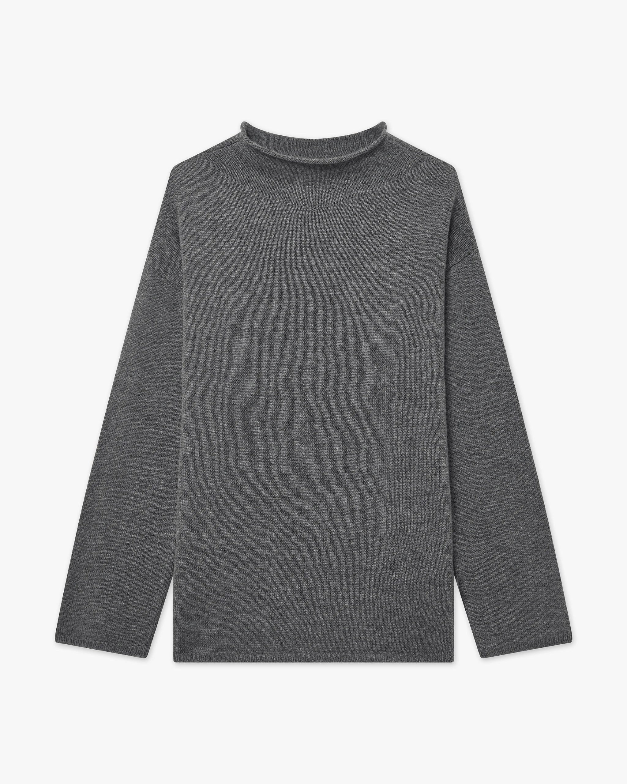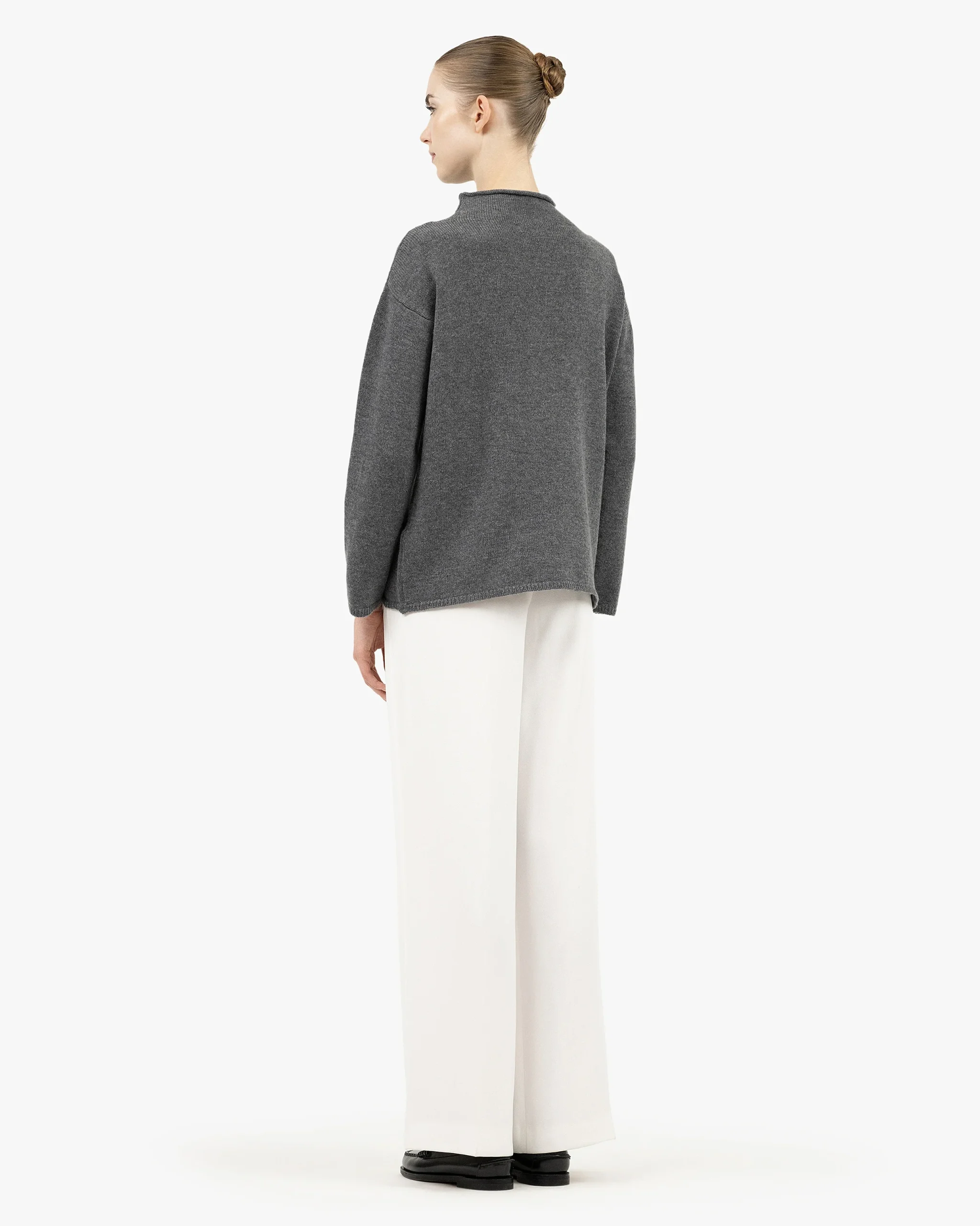 This sweater, crafted from a natural Wool-Cashmere blend, is made with a simple plain knit and stands out for its distinctive details, such as the crater neckline and low-cut armholes. The cuffs and hem are finished with a fine ribbed edge, while the slightly raised collar ends with a raw-cut hem for a subtle, modern touch.