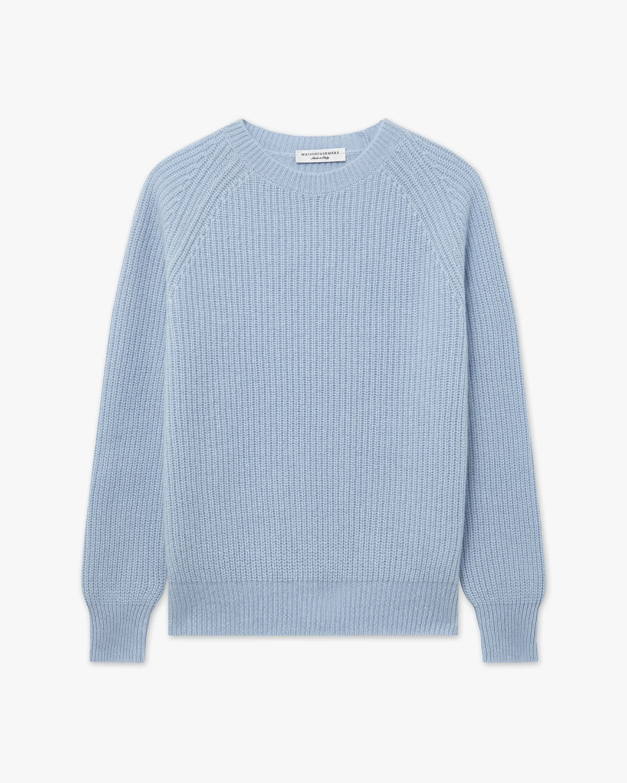 Warmth and refinement of pure cashmere come together in this classic crew neck, made unique by its fisherman’s rib knit. Featuring structured side seams that double as contrasting borders and end in small side slits, this jumper is defined by its raglan sleeves and finished with fitted ribbed edges at the neck, cuffs and hem. An essential addition to any wardrobe, offering informal elegance and effortless versatility.