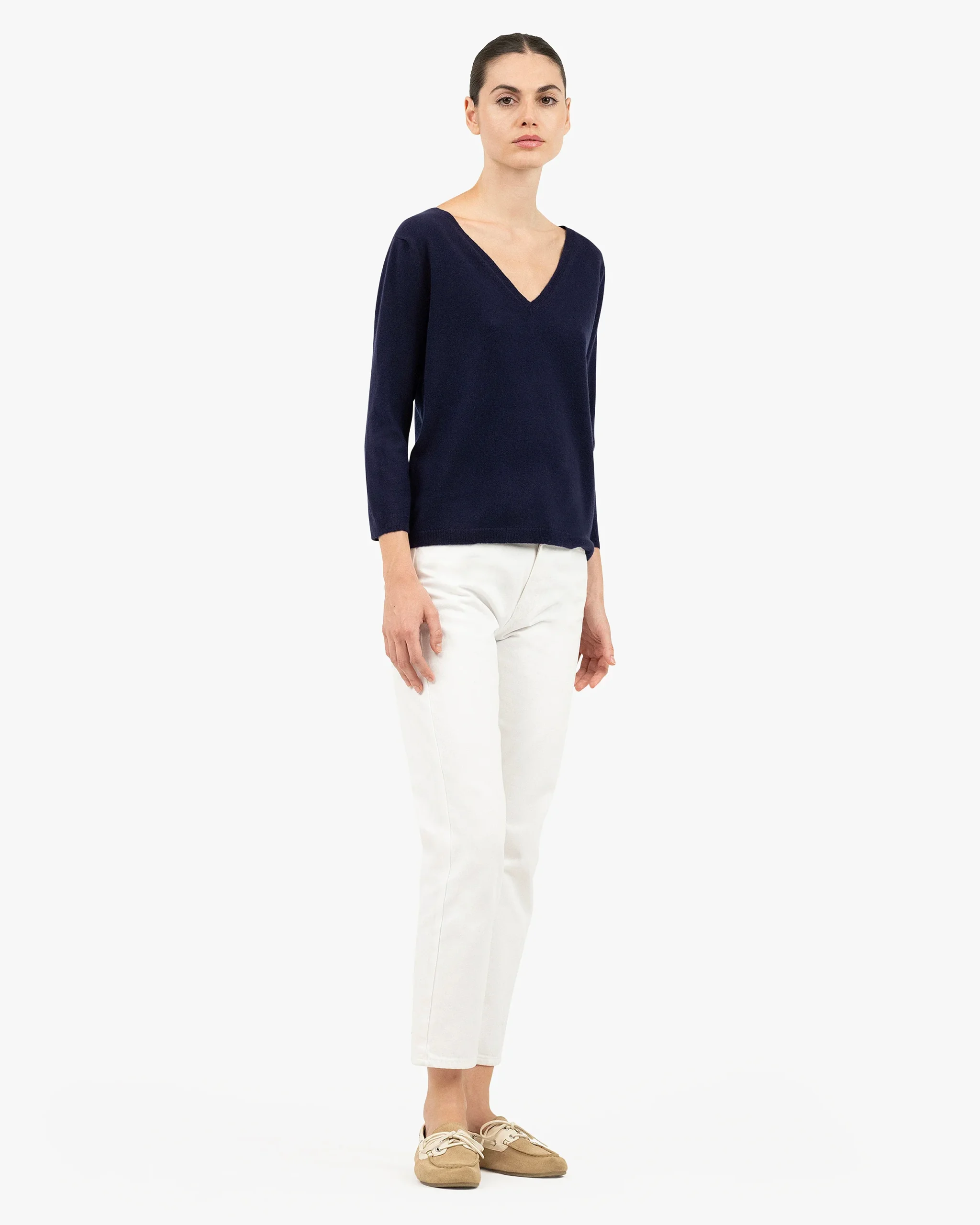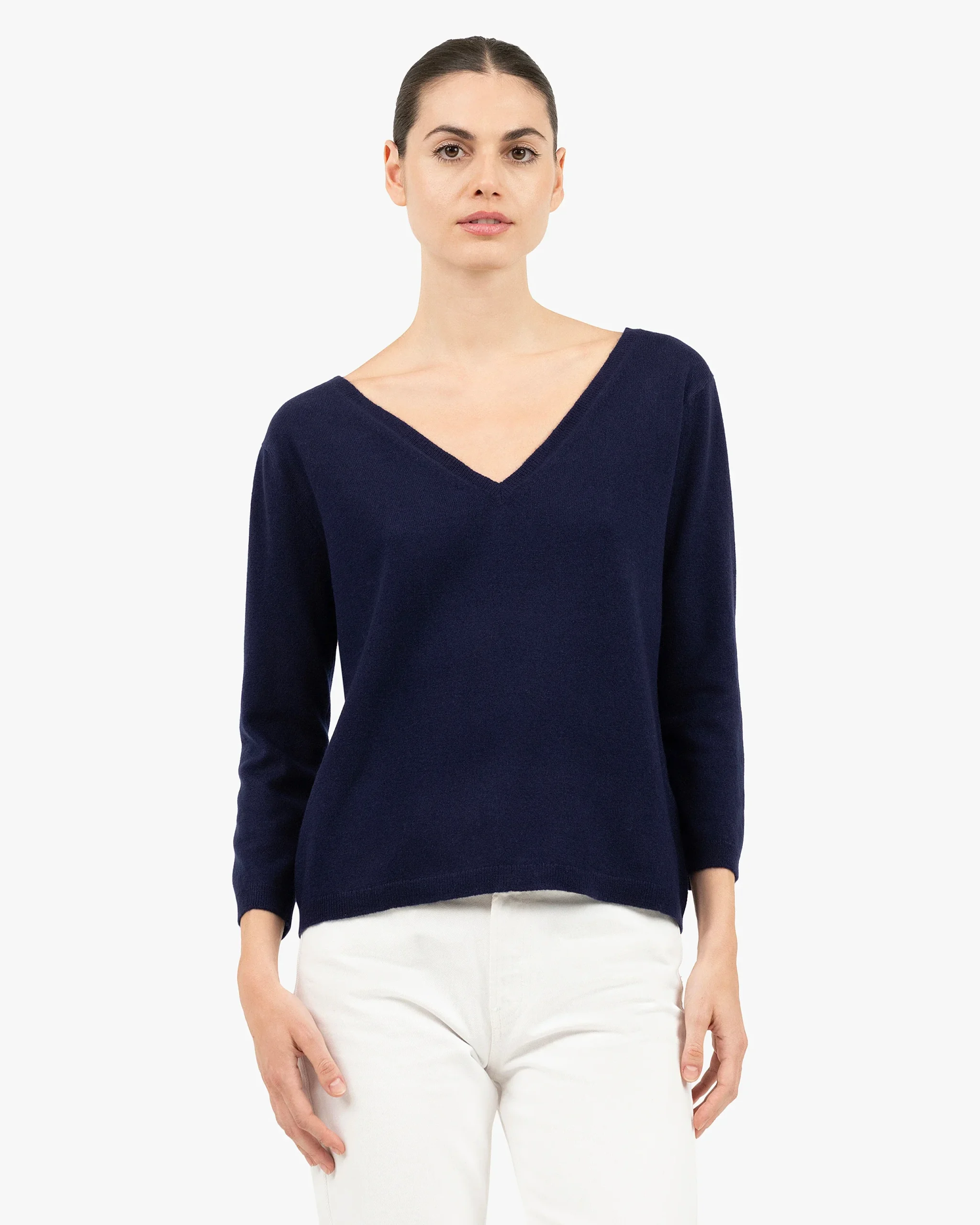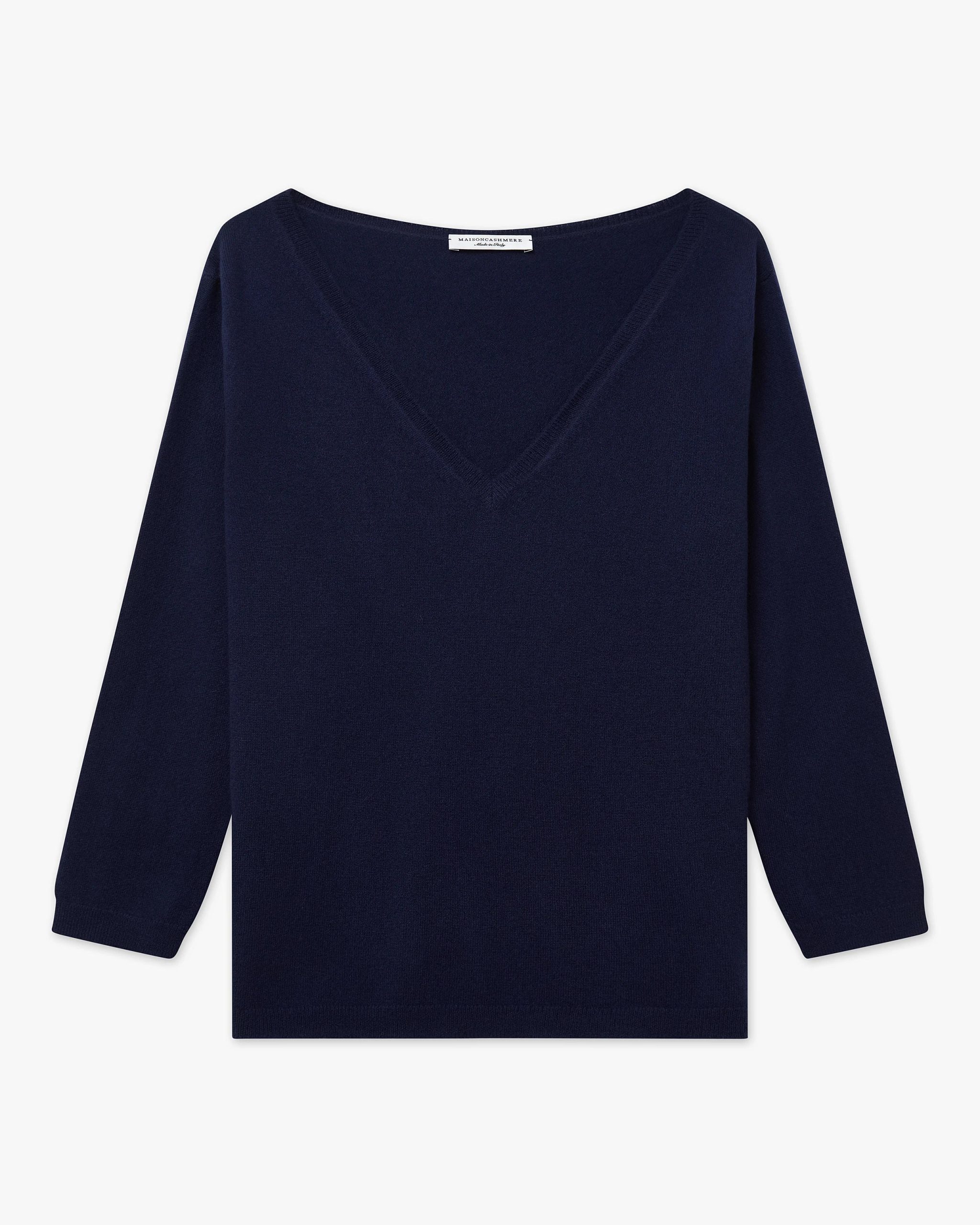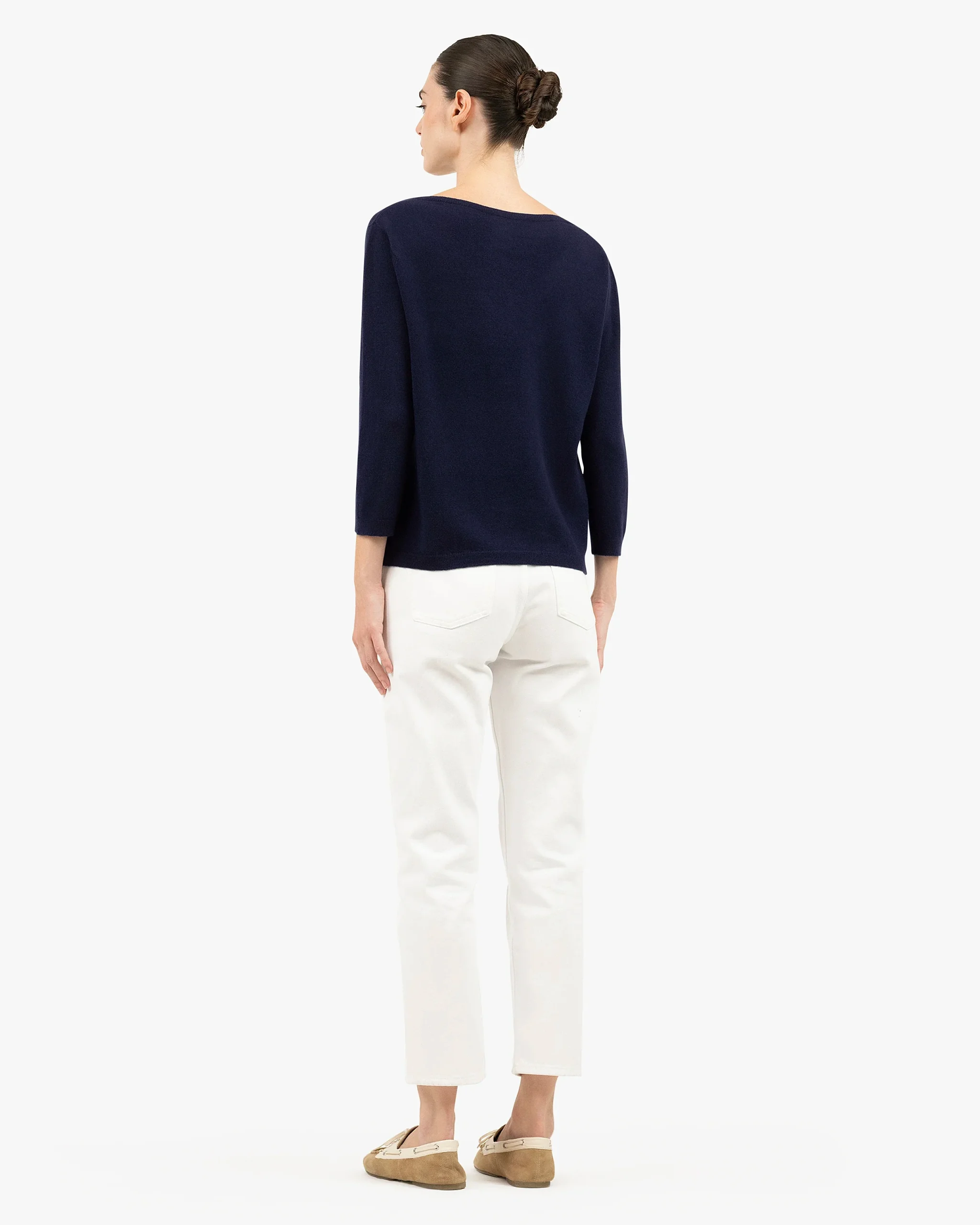 A true wardrobe essential, thanks to its clean lines and subtle ribbed trims at the neckline, cuffs and hem. Perfect for any pairing, it stands out for its wide neckline and 3/4-length sleeves. Crafted from luxurious 100% cashmere yarn, it offers lightness and softness in equal measure.