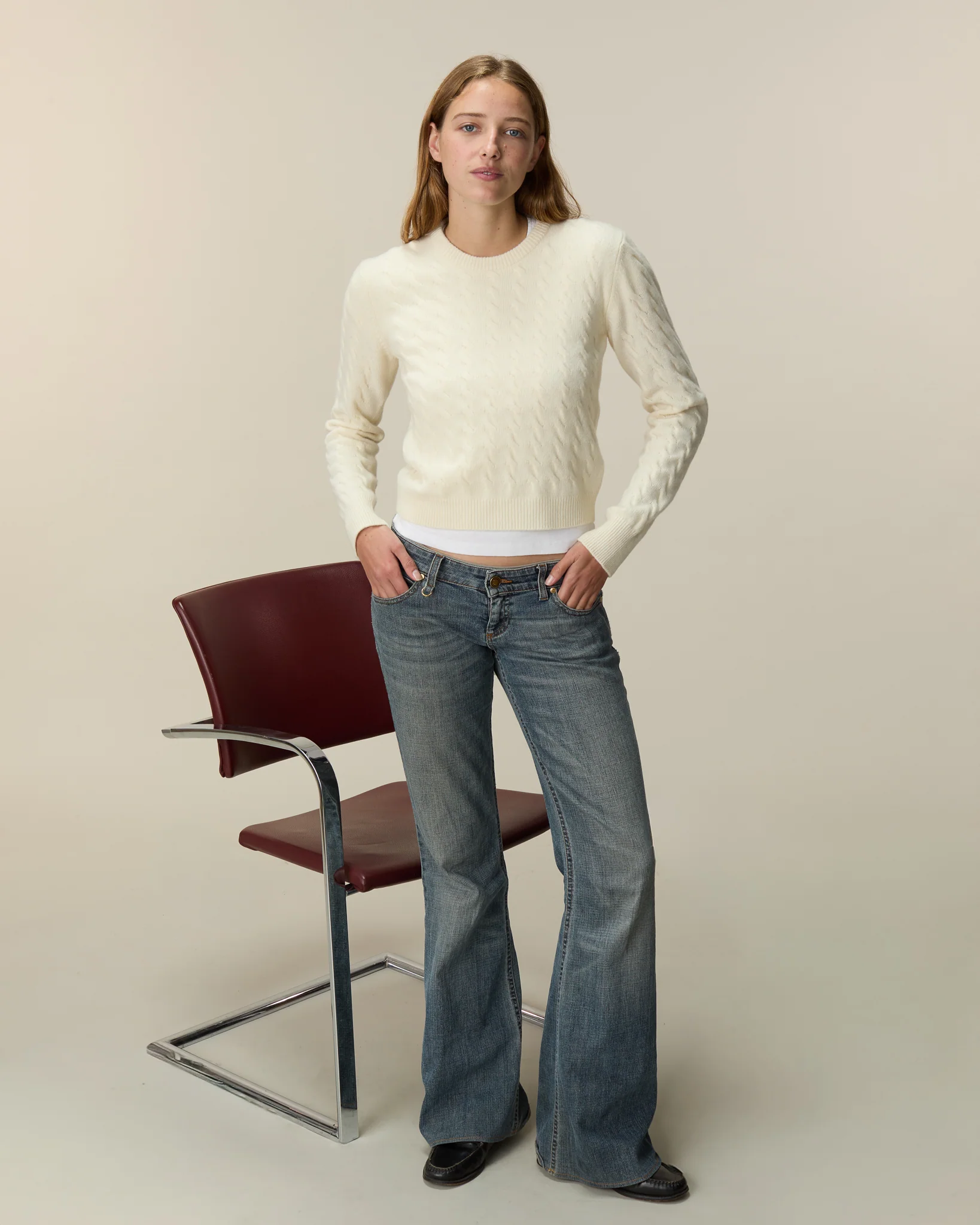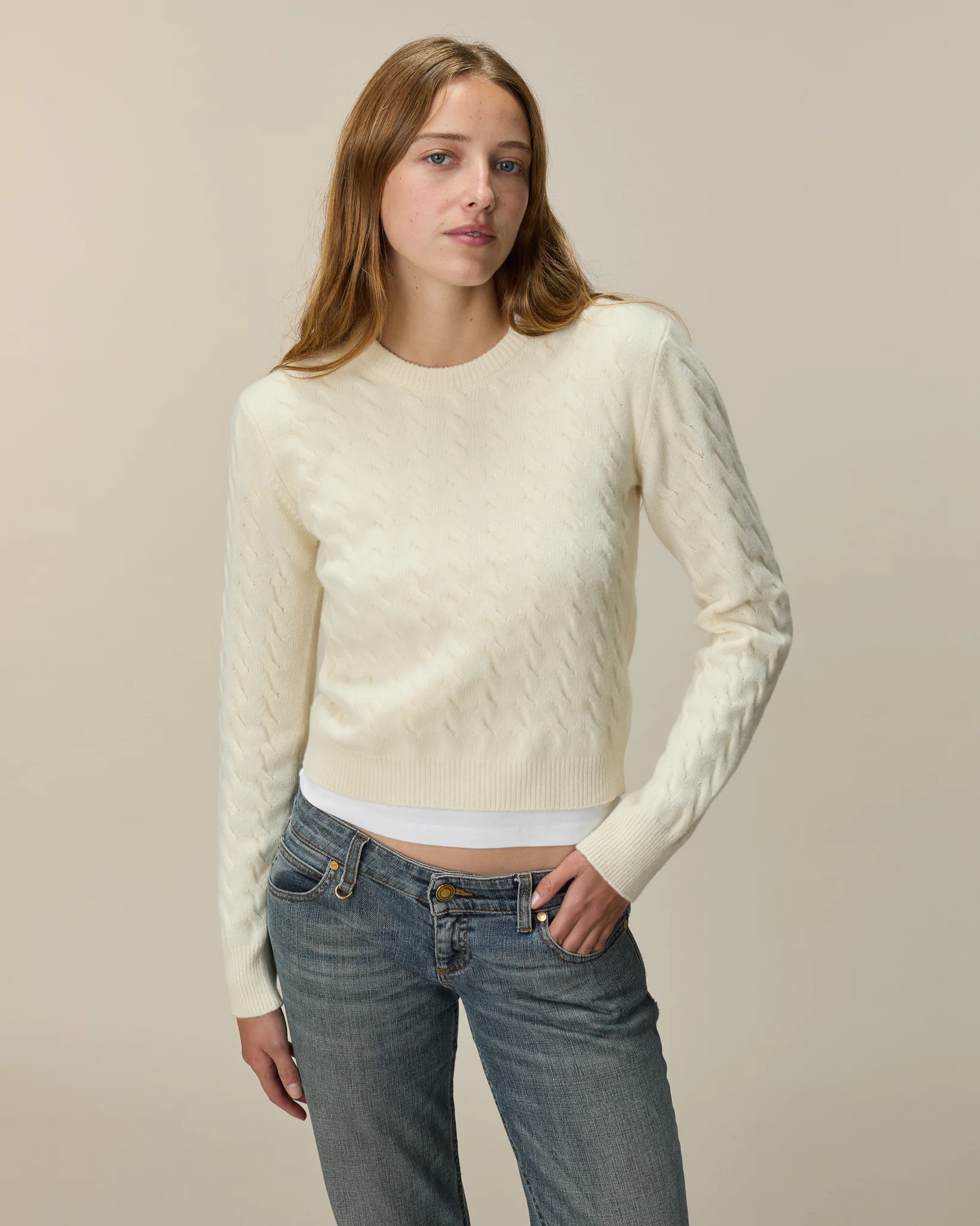 Mini cable-knit sweater in wool and cashmere: an iconic silhouette, reimagined in a cropped length with delicate mini cables. Its round neckline and close fit trace a confident, effortless line. Crafted in limited edition.